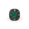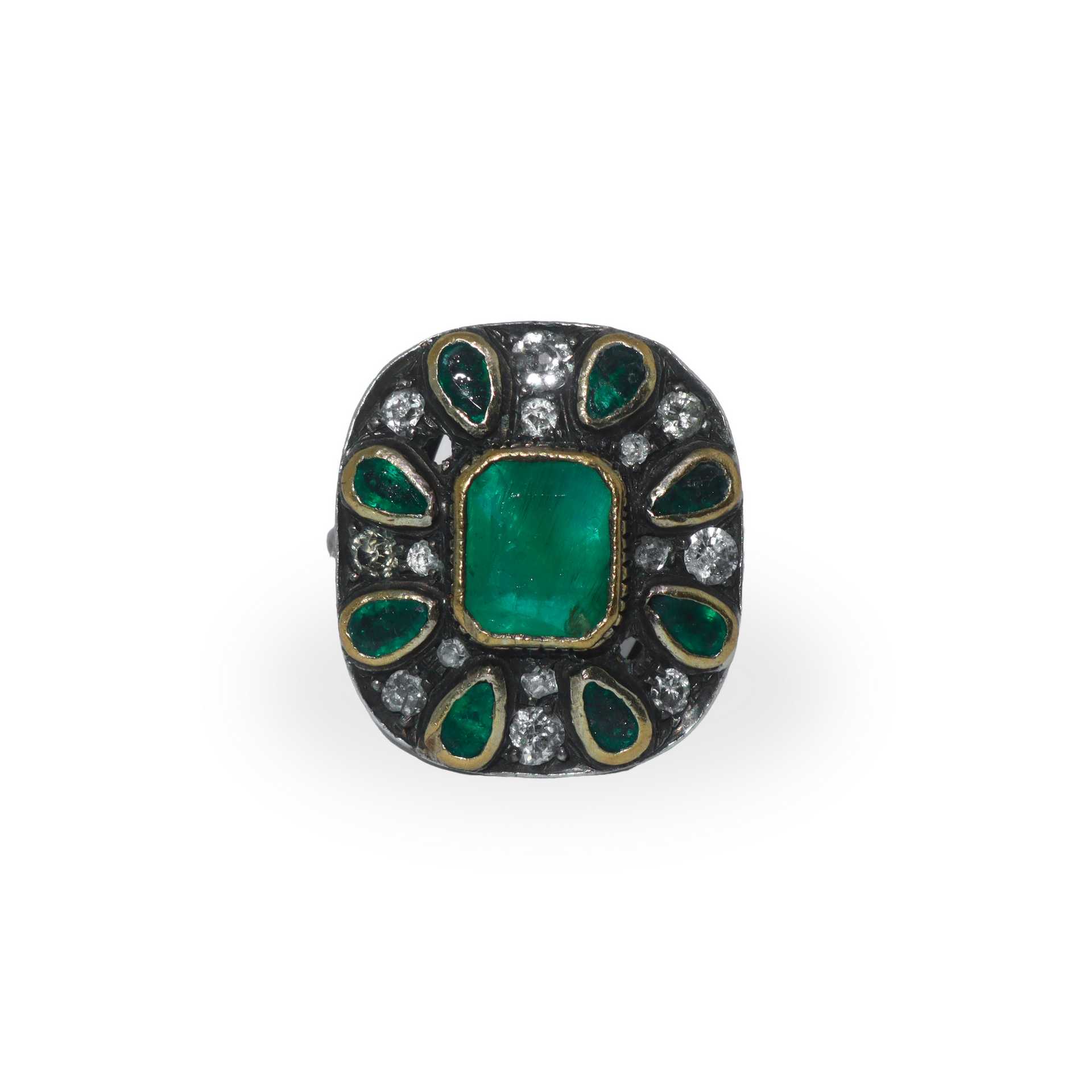 Anello in oro giallo basso titolo e argento con smeraldo centrale e ghiera con gocce di radice di smeraldo e brillanti.