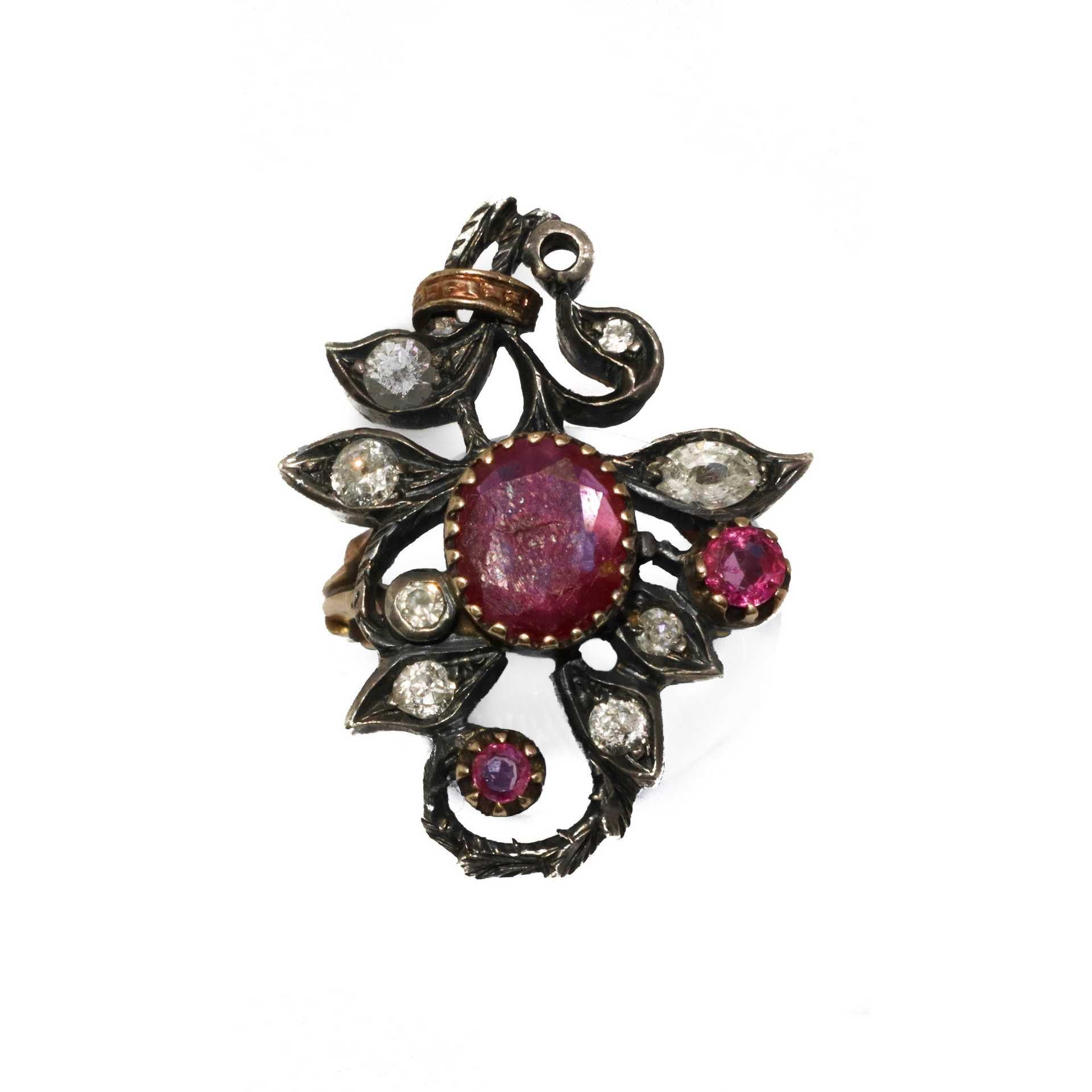 Anello in argento e oro basso titolo Raffigurante tralcio, con dimamenti e rubini. Lieve difetto alla pietra centrale.Raffigurante tralcio, con dimamenti e rubini. Lieve difetto alla pietra centrale.