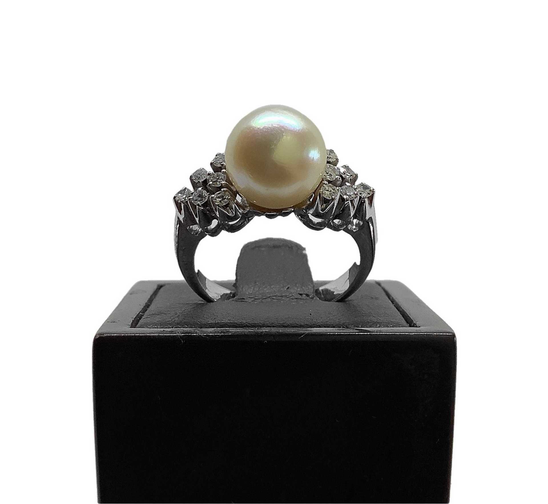 Anello in oro, 20° secolo 4,8 gr, misura 10 Lavorazione in oro bianco, perla centrale, lavorazione laterale con brillantini.Lavorazione in oro bianco, perla centrale, lavorazione laterale con brillantini.