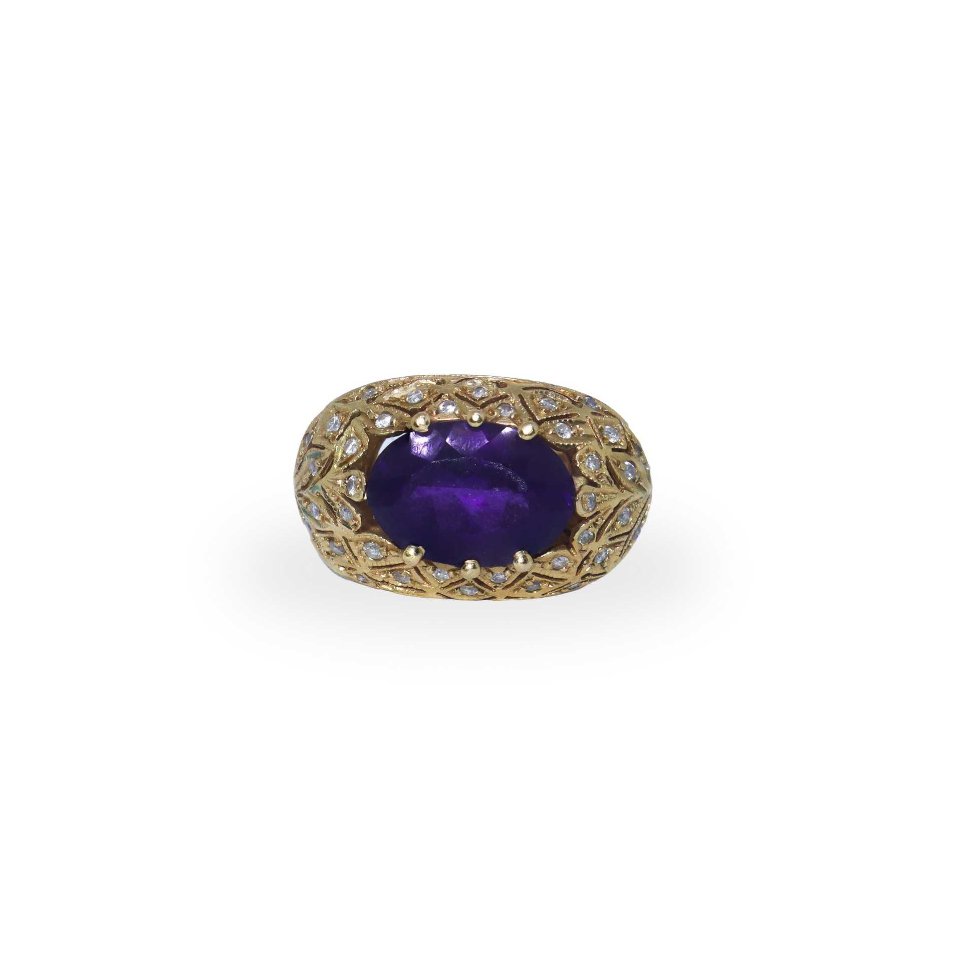Anello in oro giallo 18 kt con ametista taglio ovale e piccoli brillanti