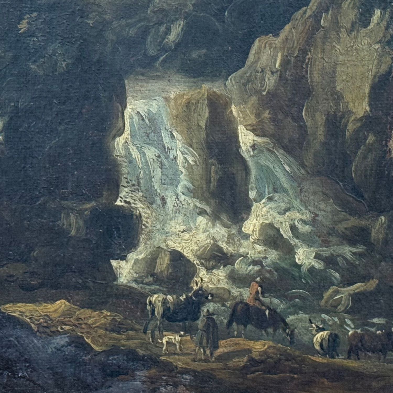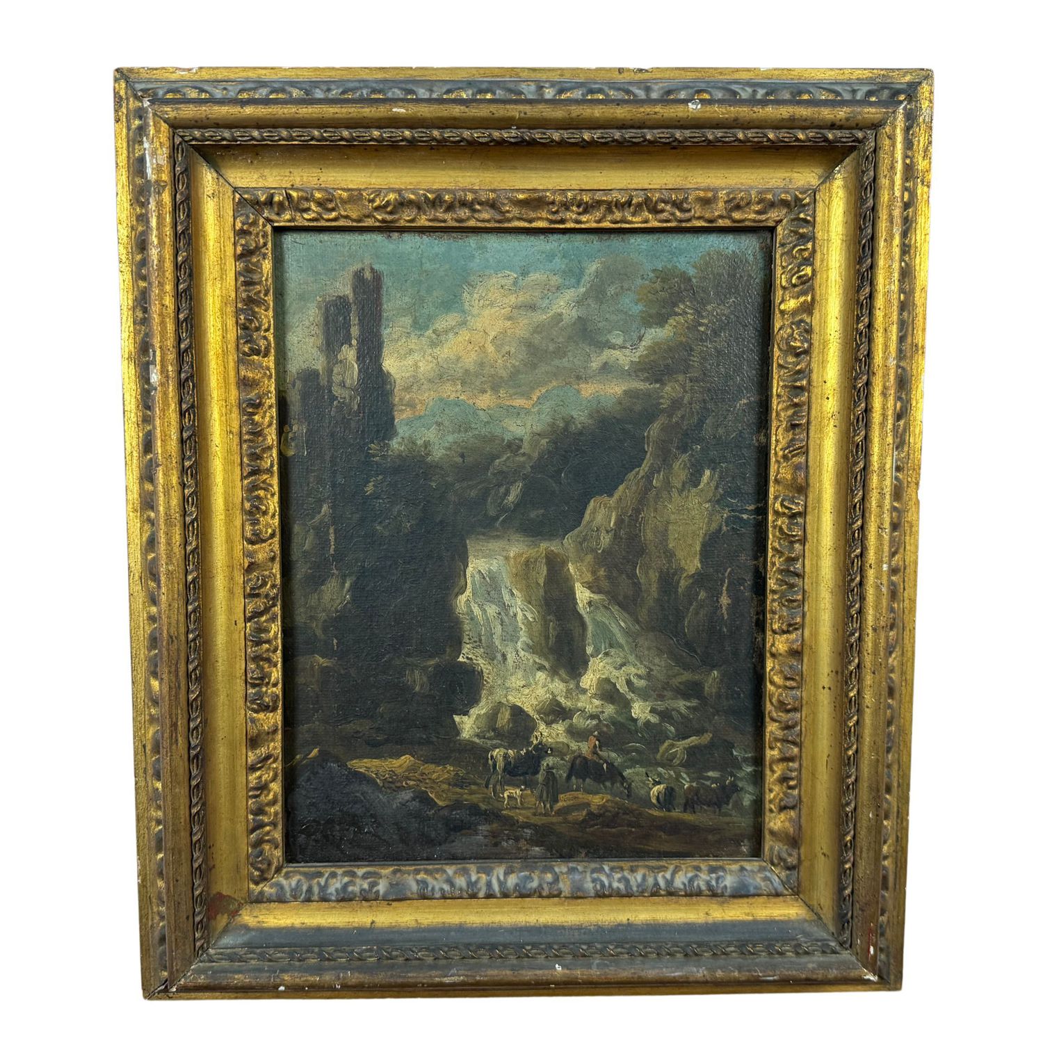 Dipinto olio su tela, periodo XIX secolo scuola Italiana, raffigurante Paesaggio con cascata e armenti.