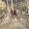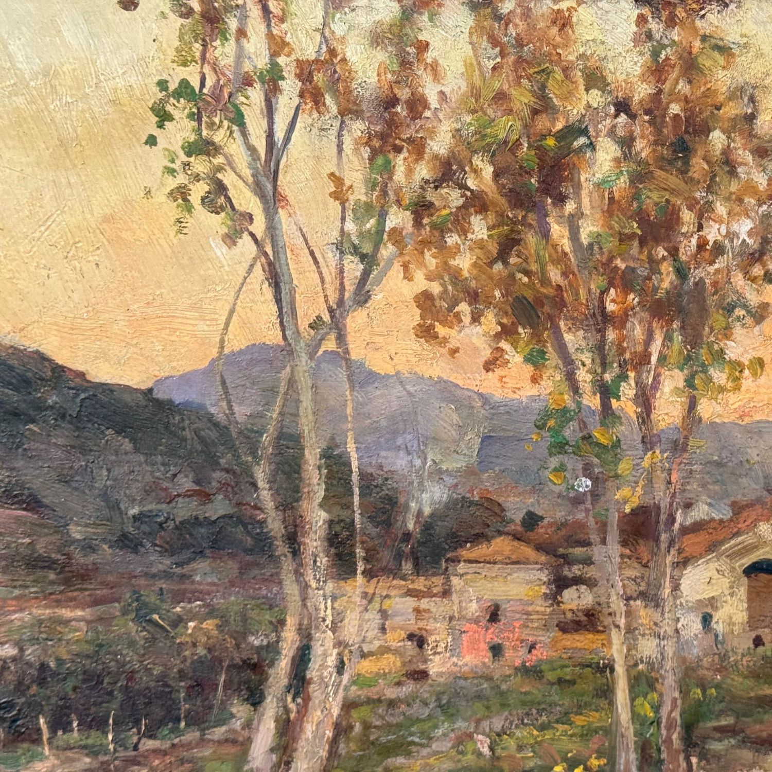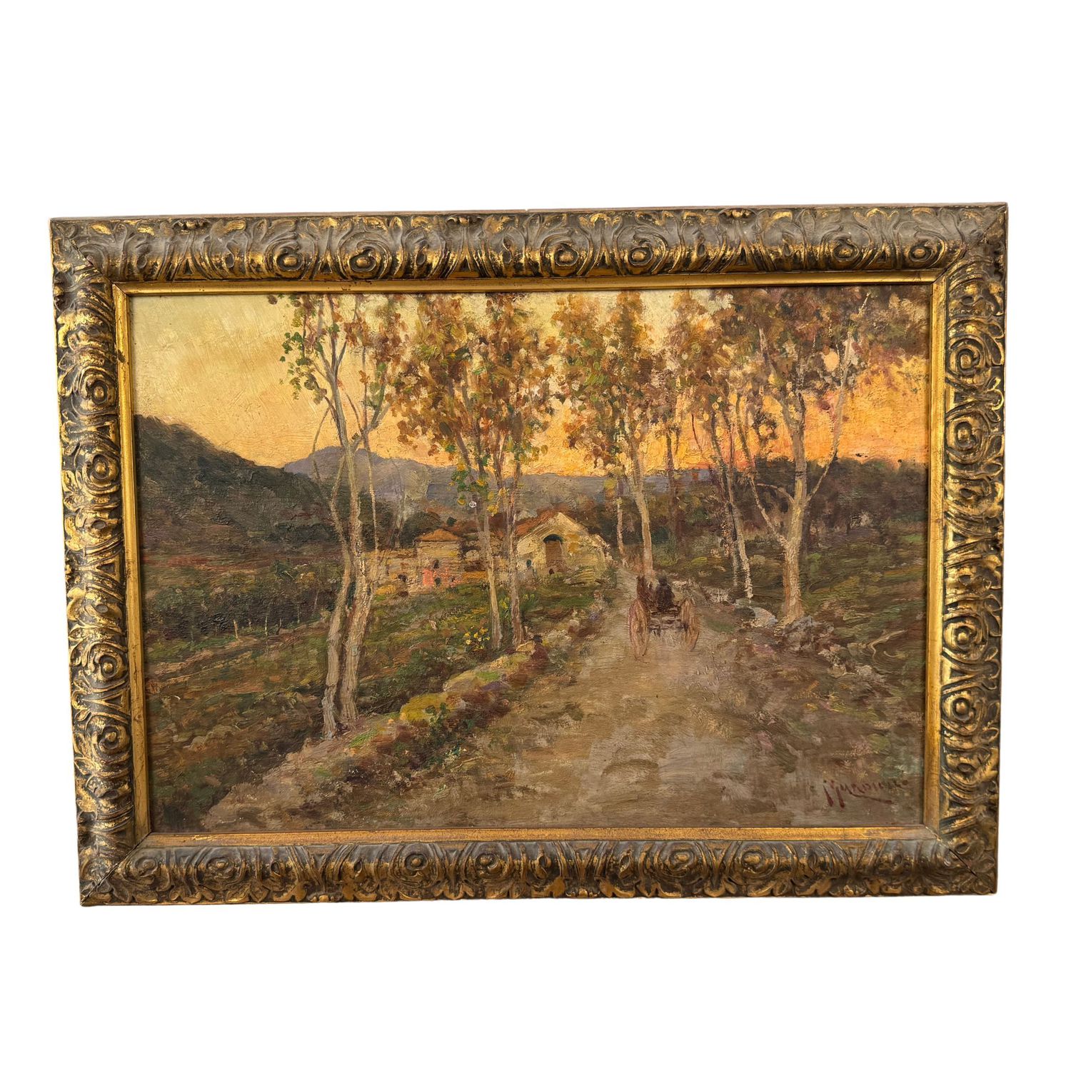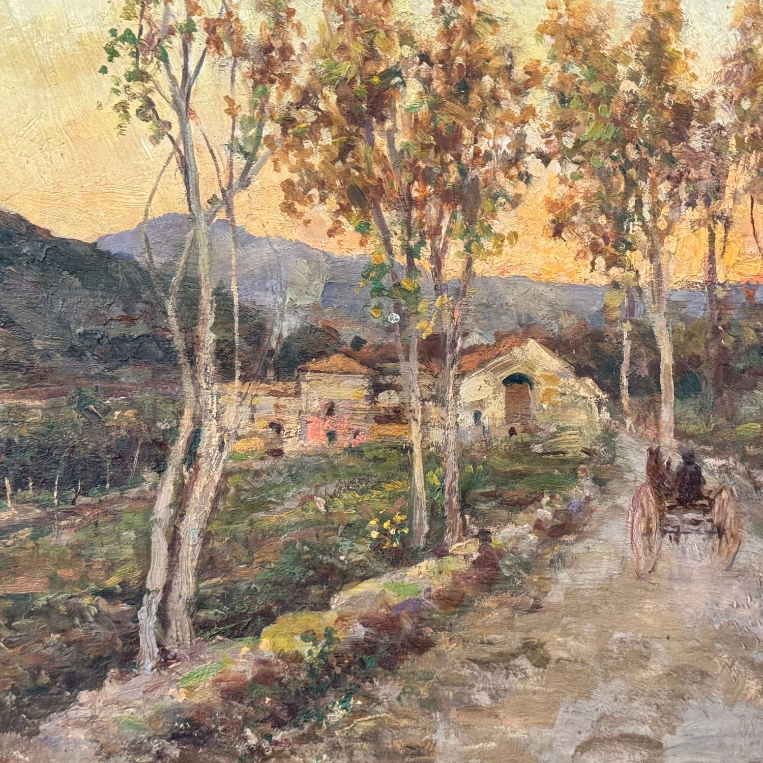 Dipinto olio su tavola, periodo XIX/XX secolo scuola Italiana, raffigurante Strada di paese con paesaggio e carrozza.