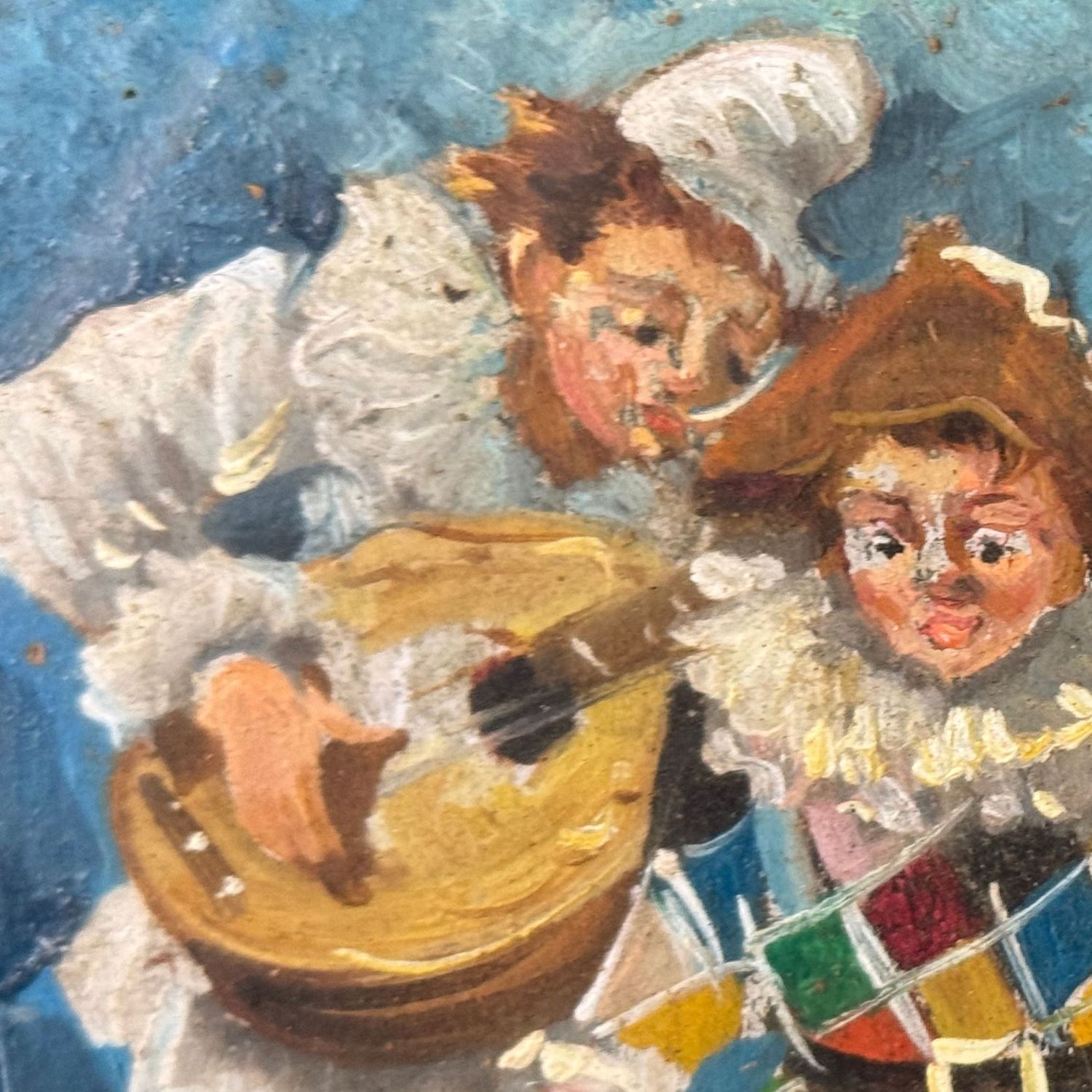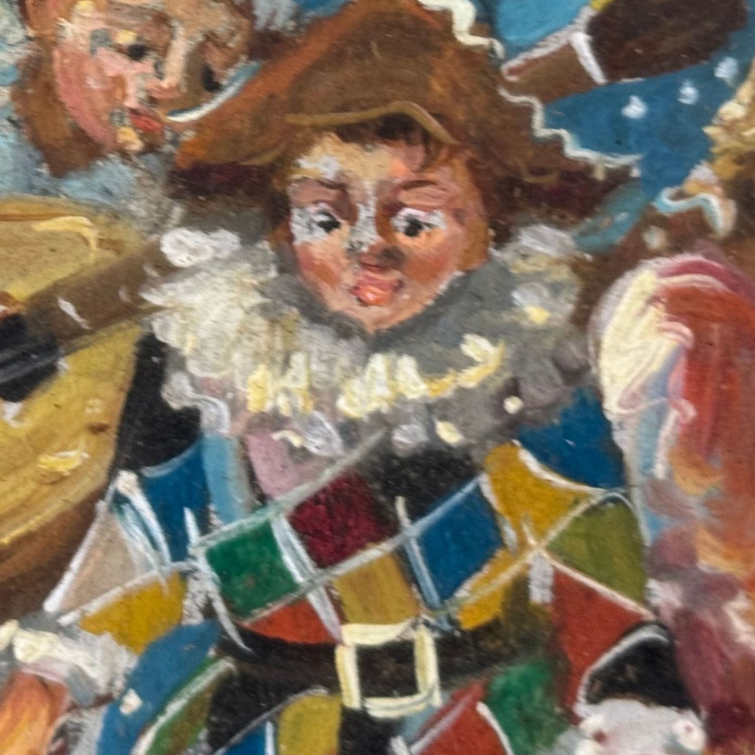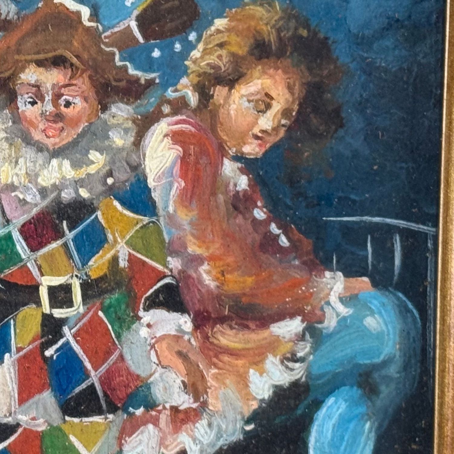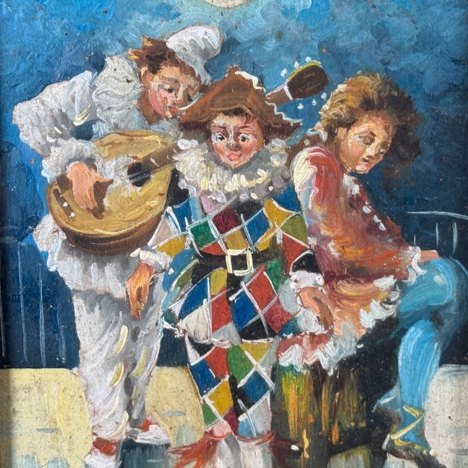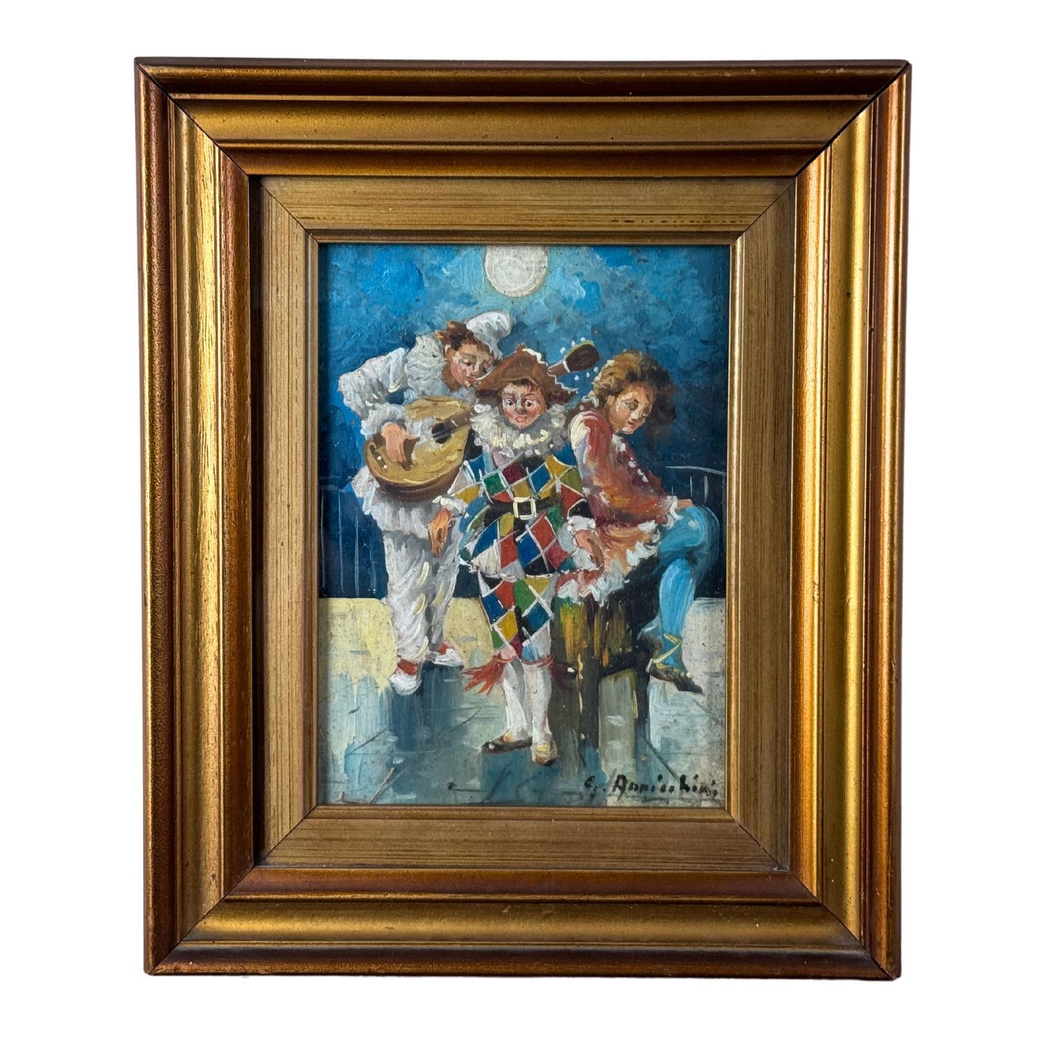 Dipinto olio su pannello, periodo XX secolo scuola Italiana, raffigurante Tre ragazzi in abito carnevalesco. Dimensioni interno cornice: 18x24 cm. Dimensioni compreso cornice: 30x36 cm. Reca firma in basso a destra da Giuseppe Annichini. Opera in buone condizioni.