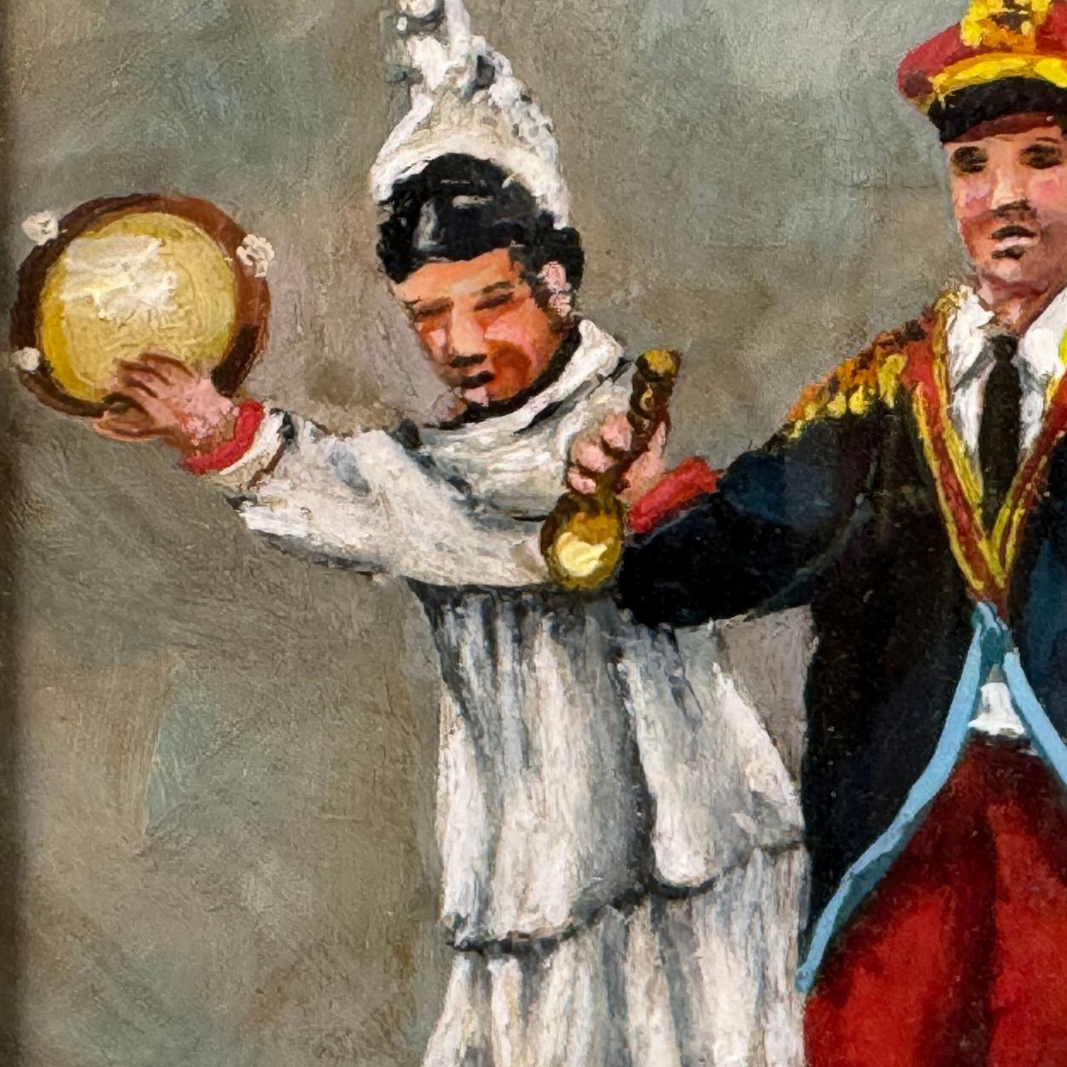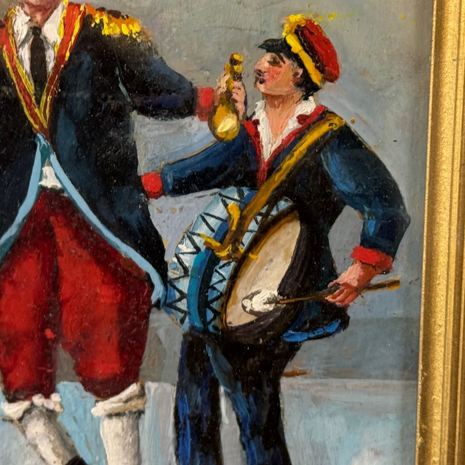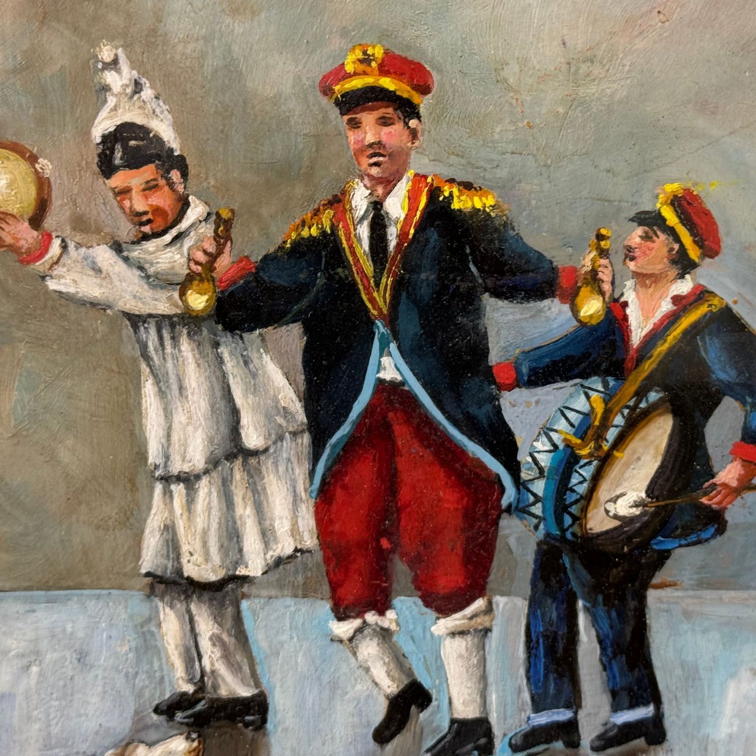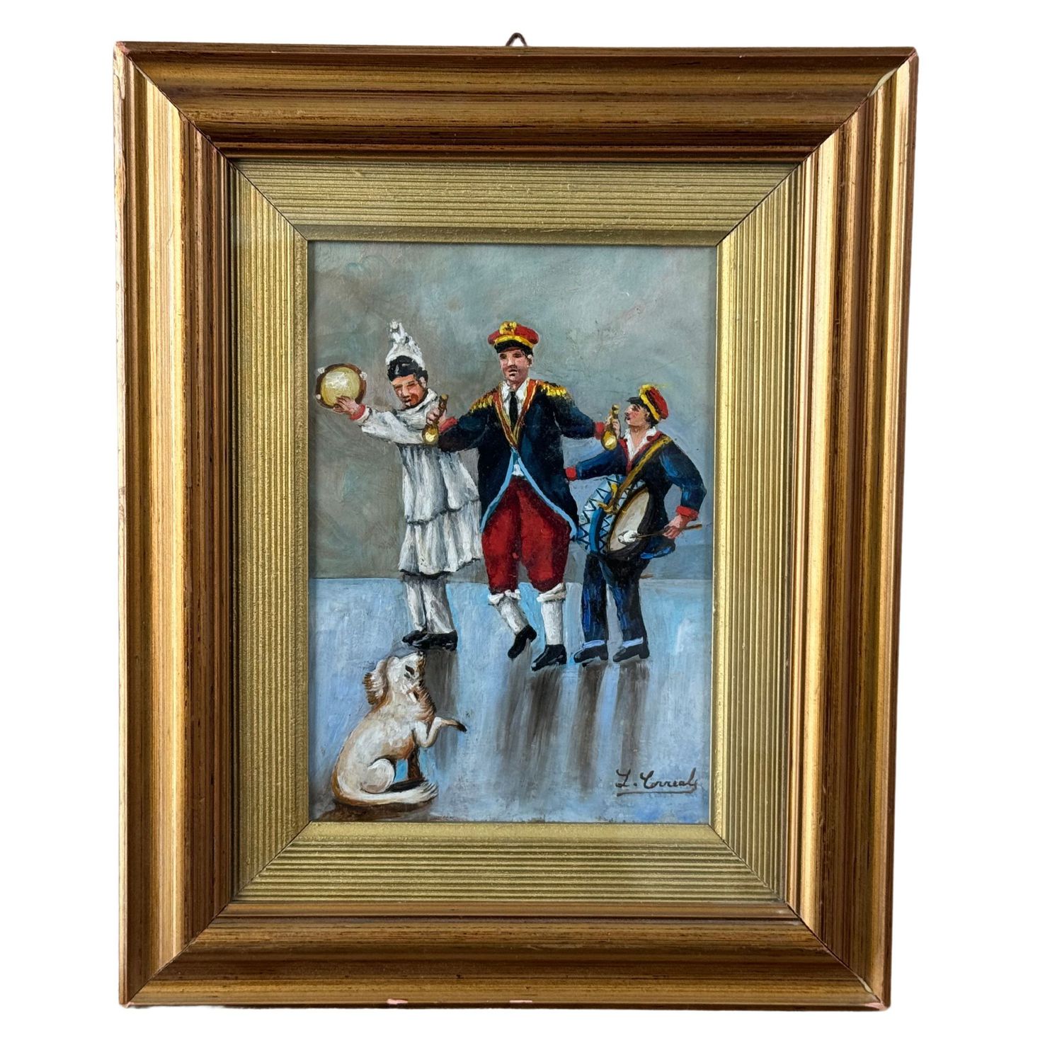 Dipinto olio su pannello, periodo XX secolo scuola italiana, raffigurante Artisti di strada. Dimensioni interno cornice: 16,5x22 cm. Dimensioni compreso cornice: 26x33 cm. Reca firma in basso a destra da S.Correale. Opera in buone condizioni.