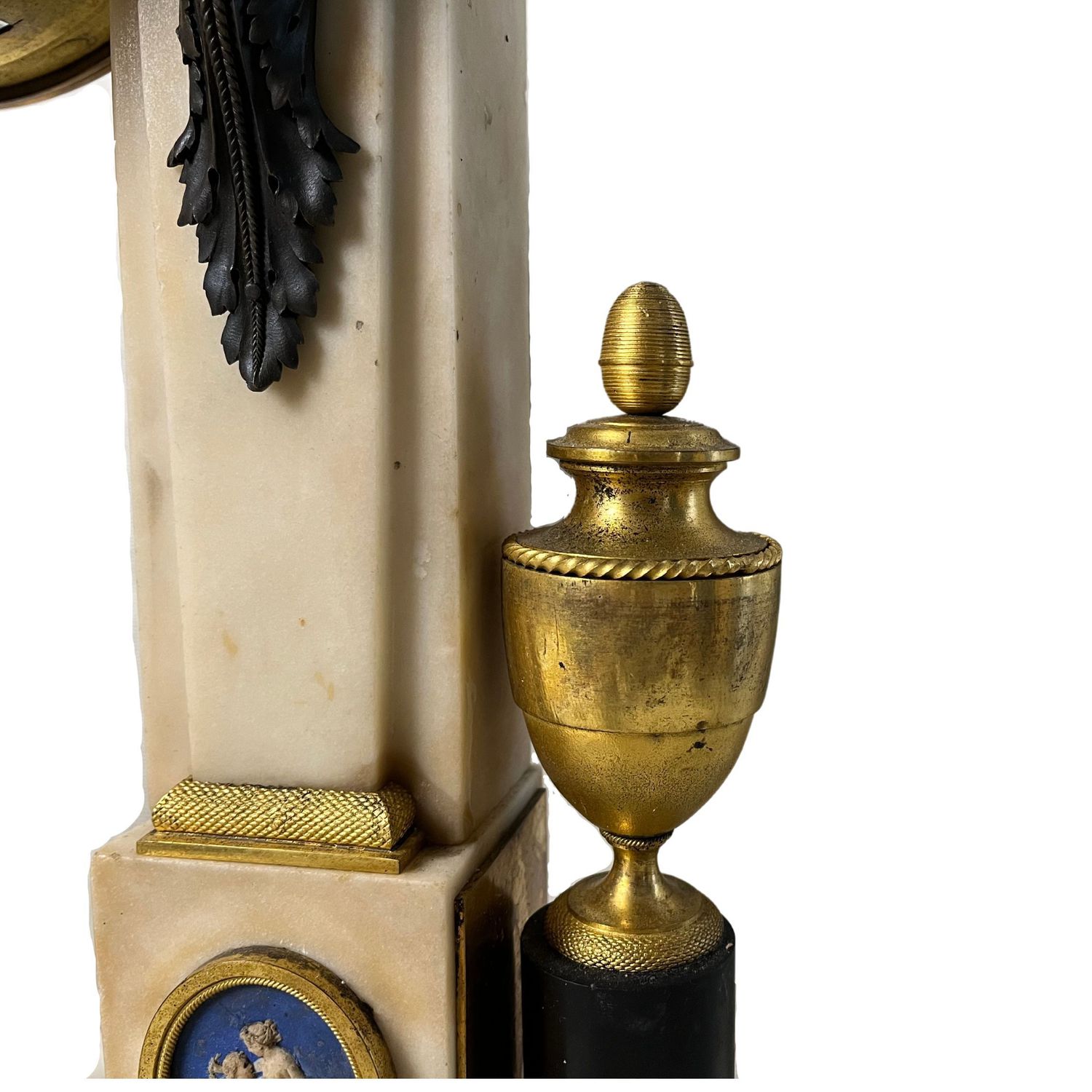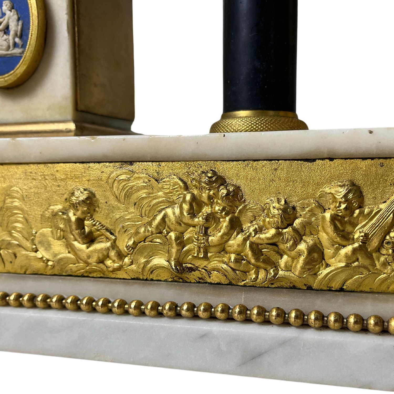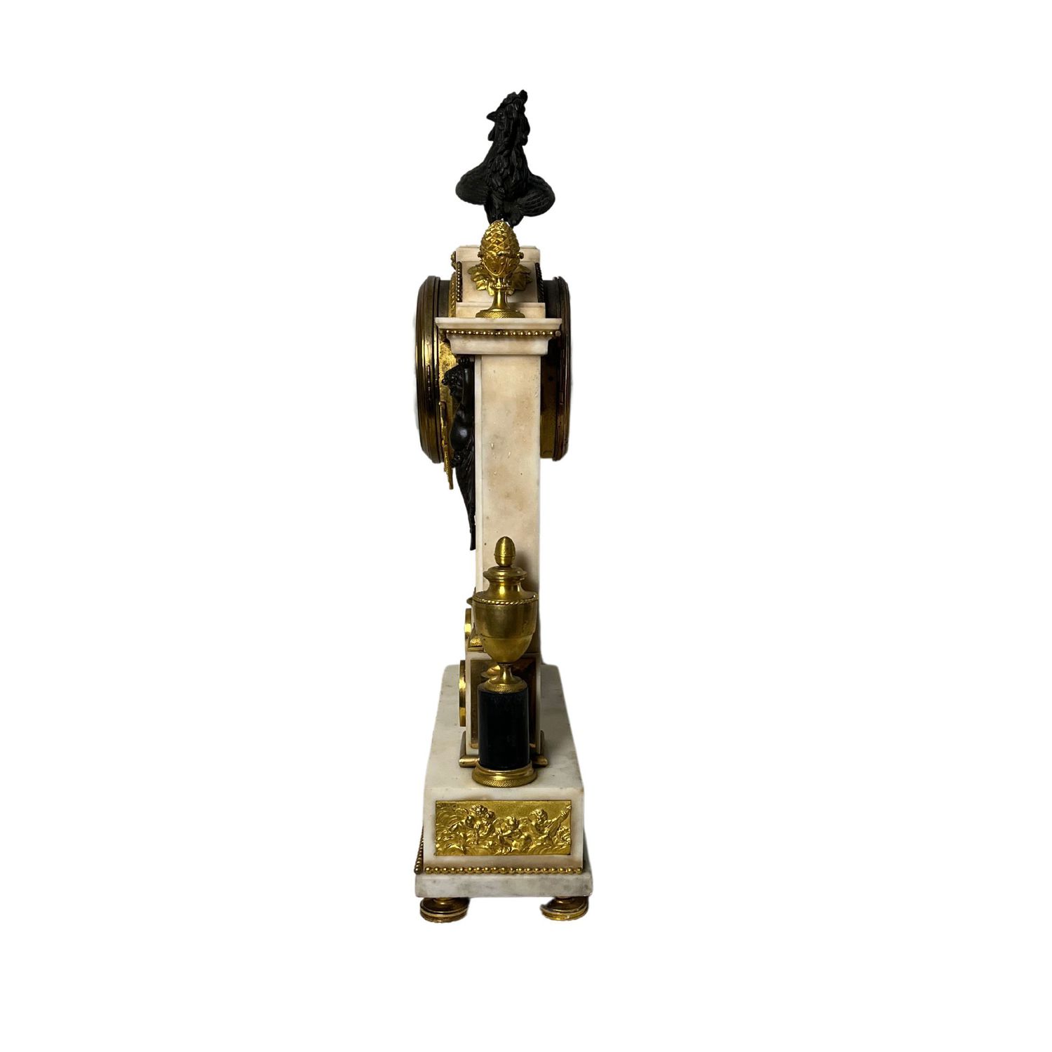 Importante orologio, periodo Luigi XVI in marmo bianco sorretto da due colonne, arricchito da bronzo dorato finemente cisellato.