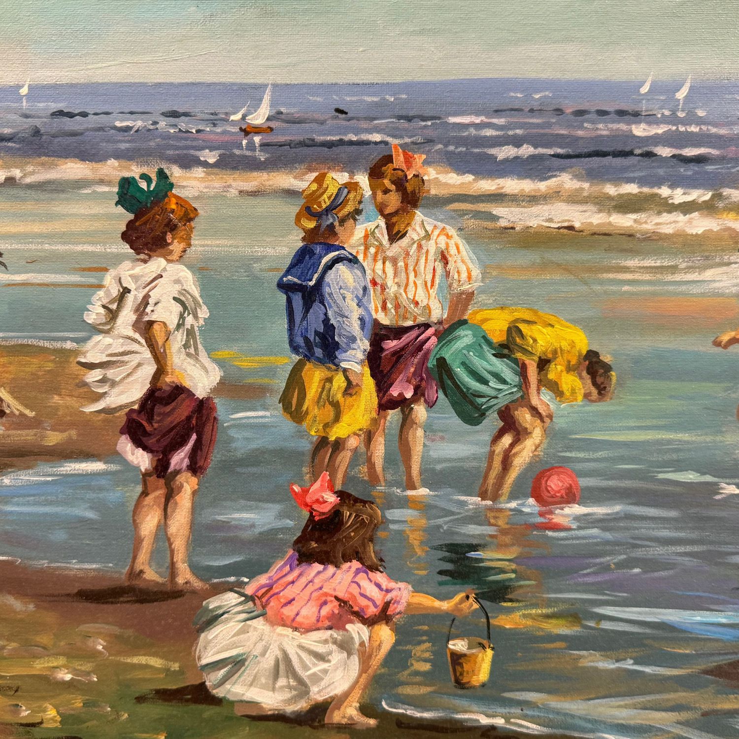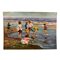 Dipinto olio su pannello, periodo XX secolo scuola Continentale, raffigurante Giochi sul mare.