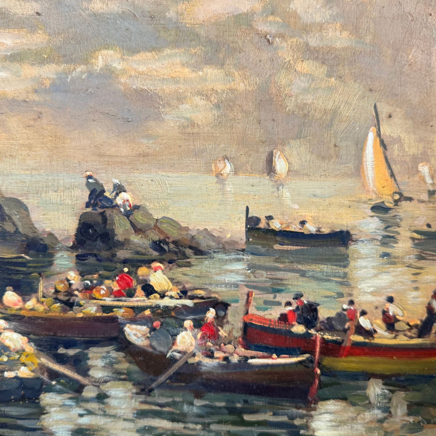 Dipinto olio su cartoncino, periodo XX secolo scuola Italiana, raffigurante Scorcio di marina.
