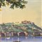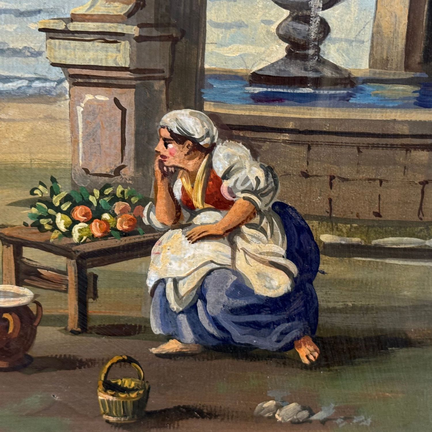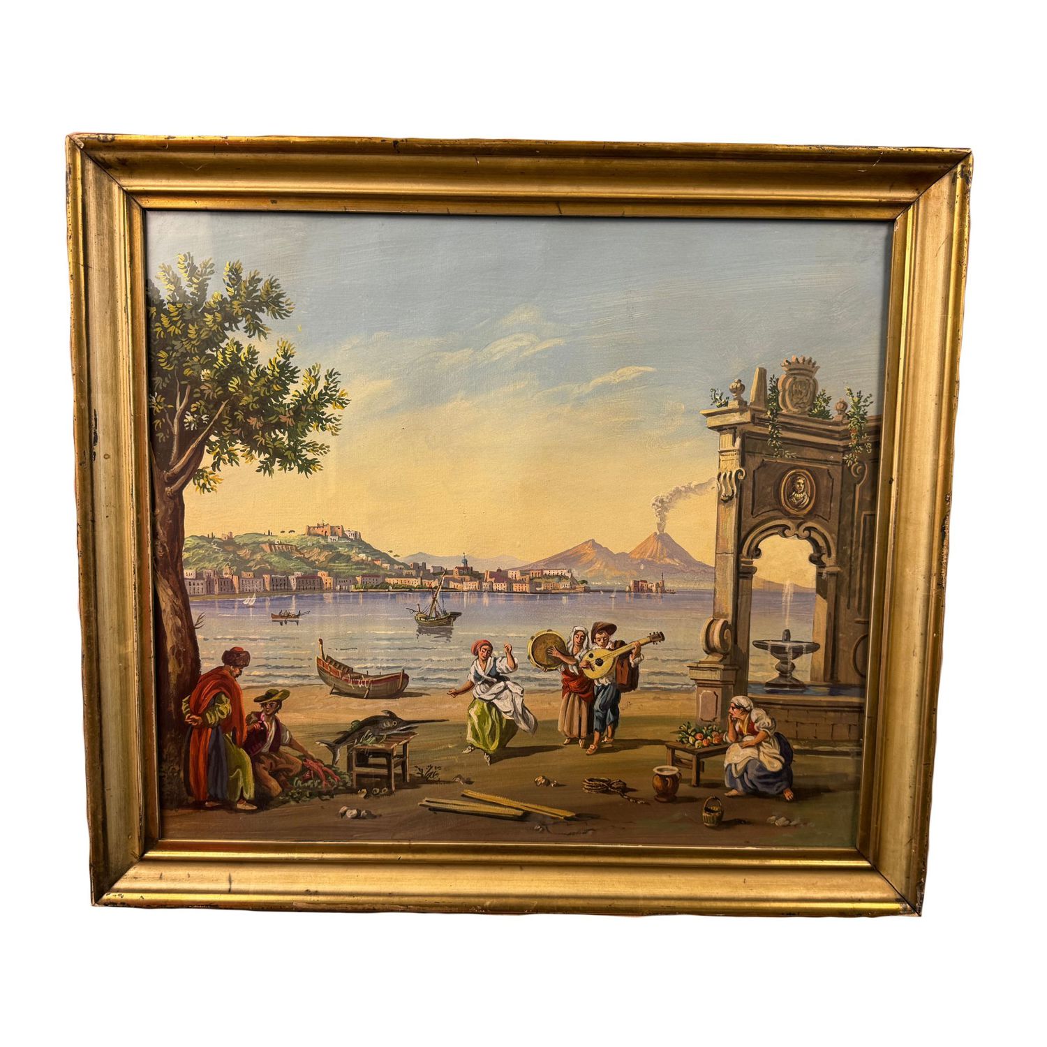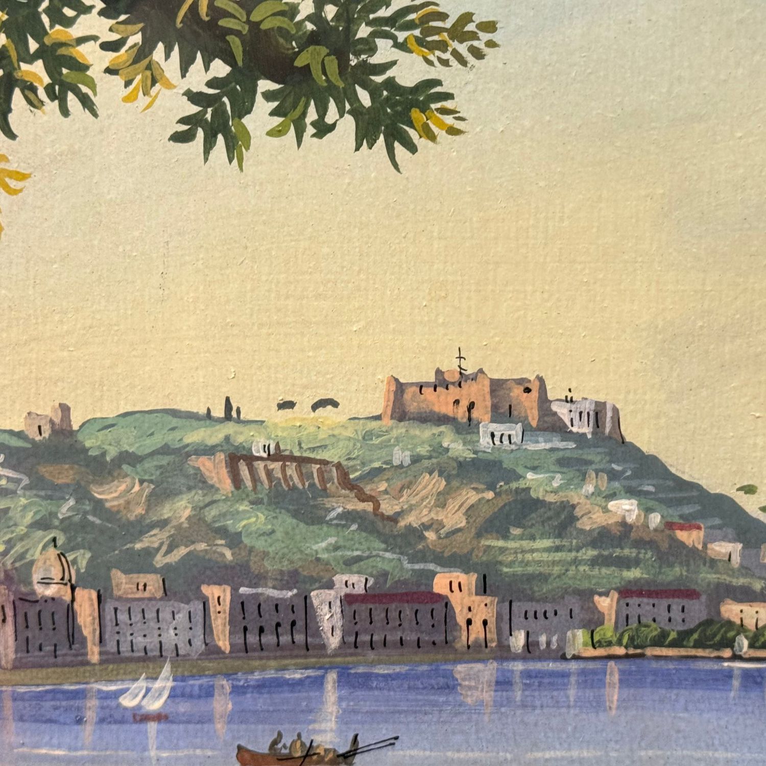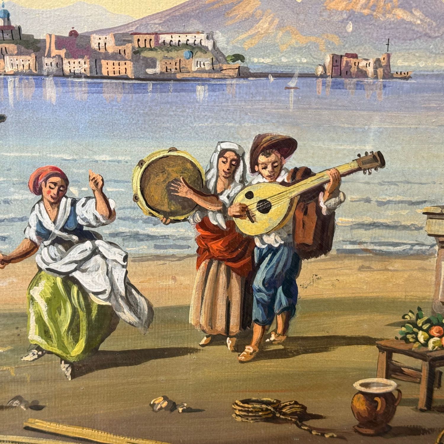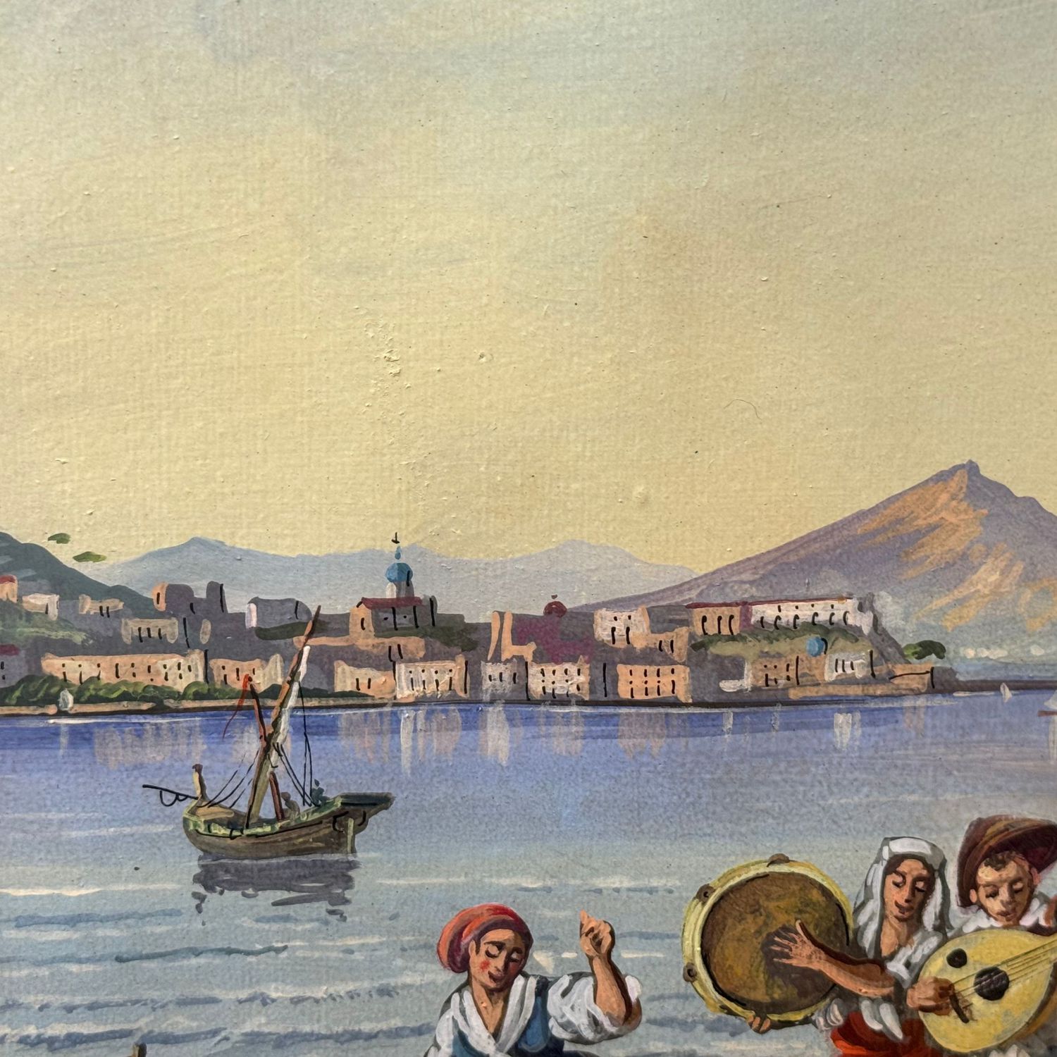 Dipinto guazzo (tempera su carta), periodo inizio XX secolo scuola napoletana, raffigurante Veduta di Napoli e scena popolare.