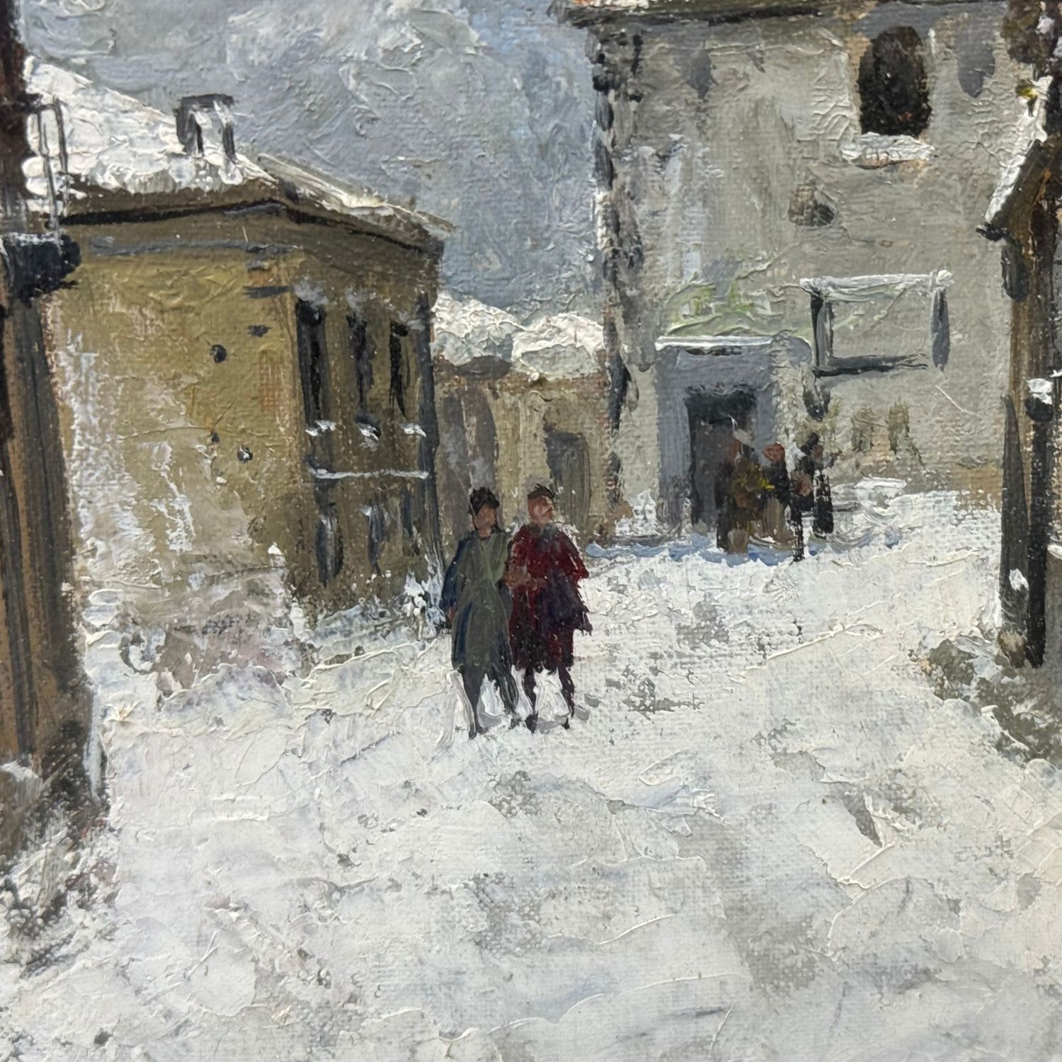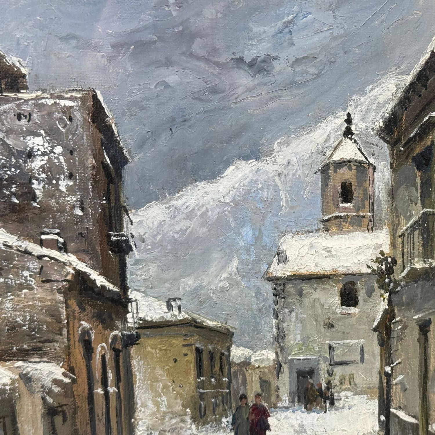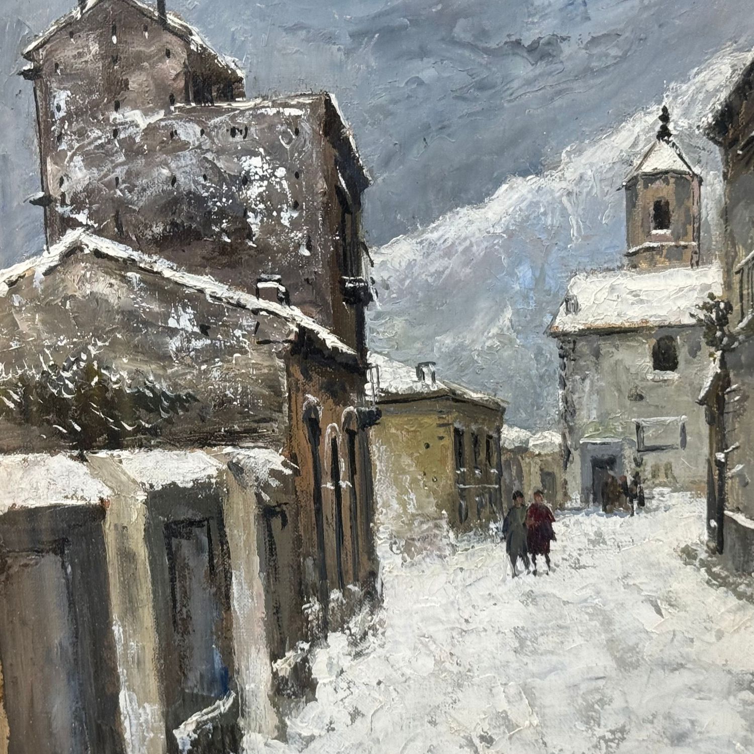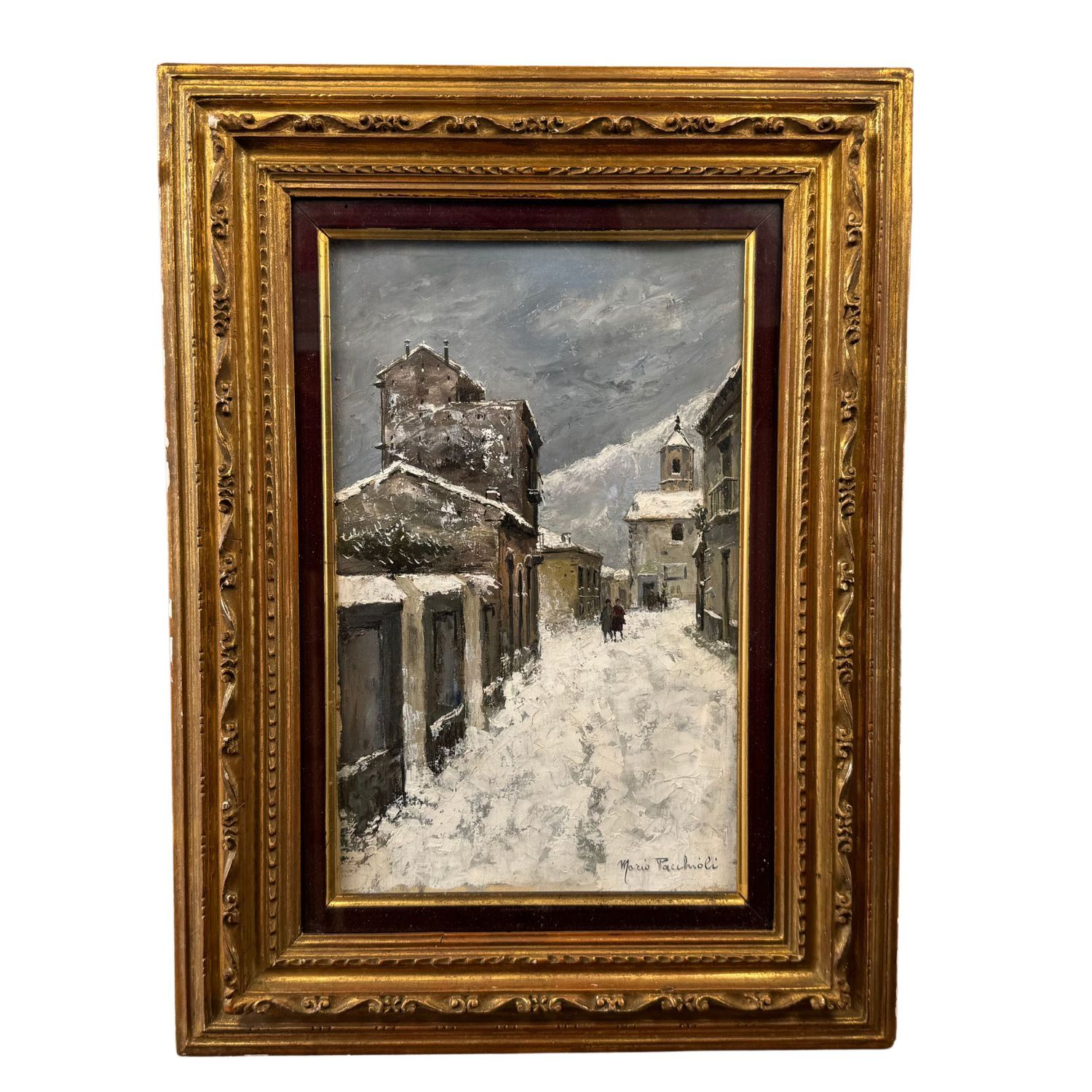 Dipinto olio su tela, periodo XX secolo scuola Italiana, raffigurante Strada innevata.