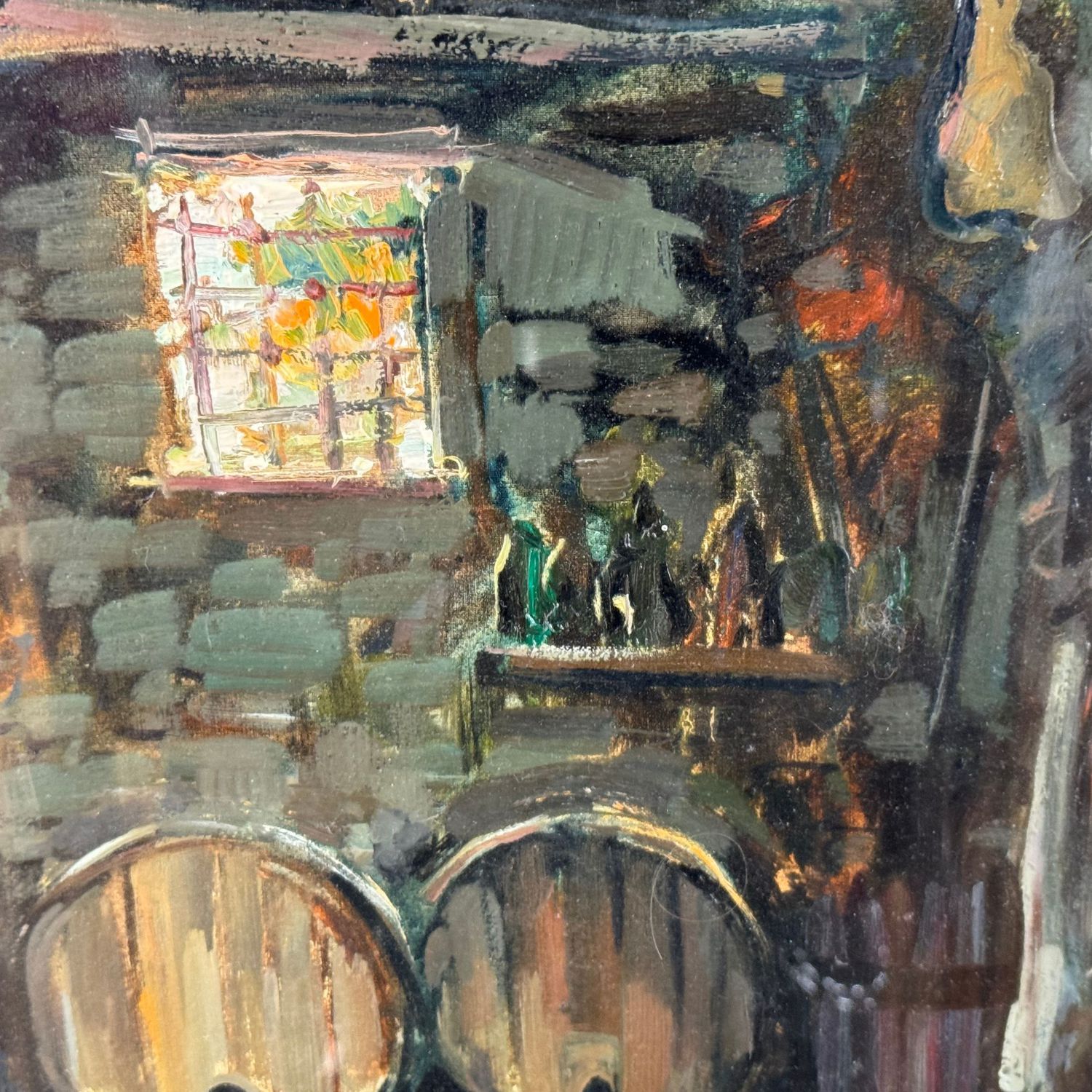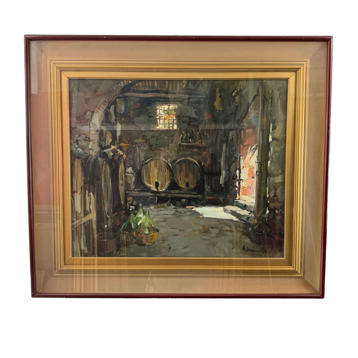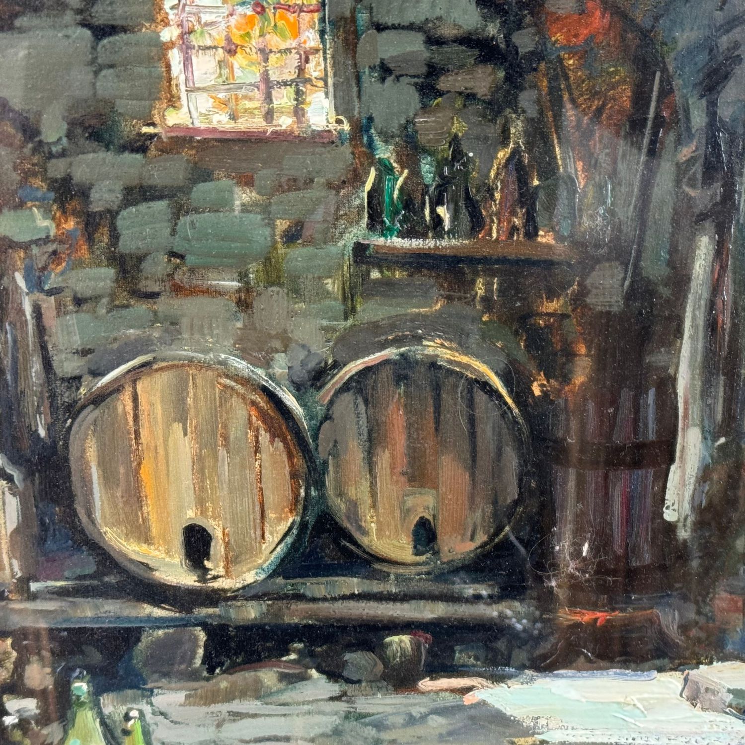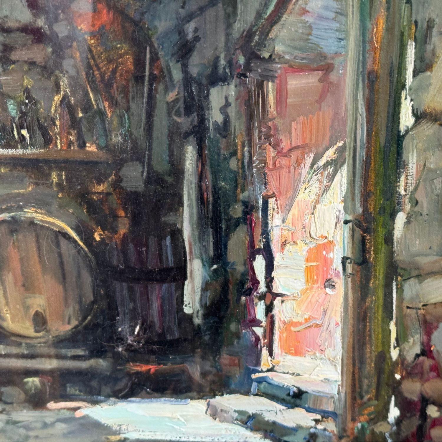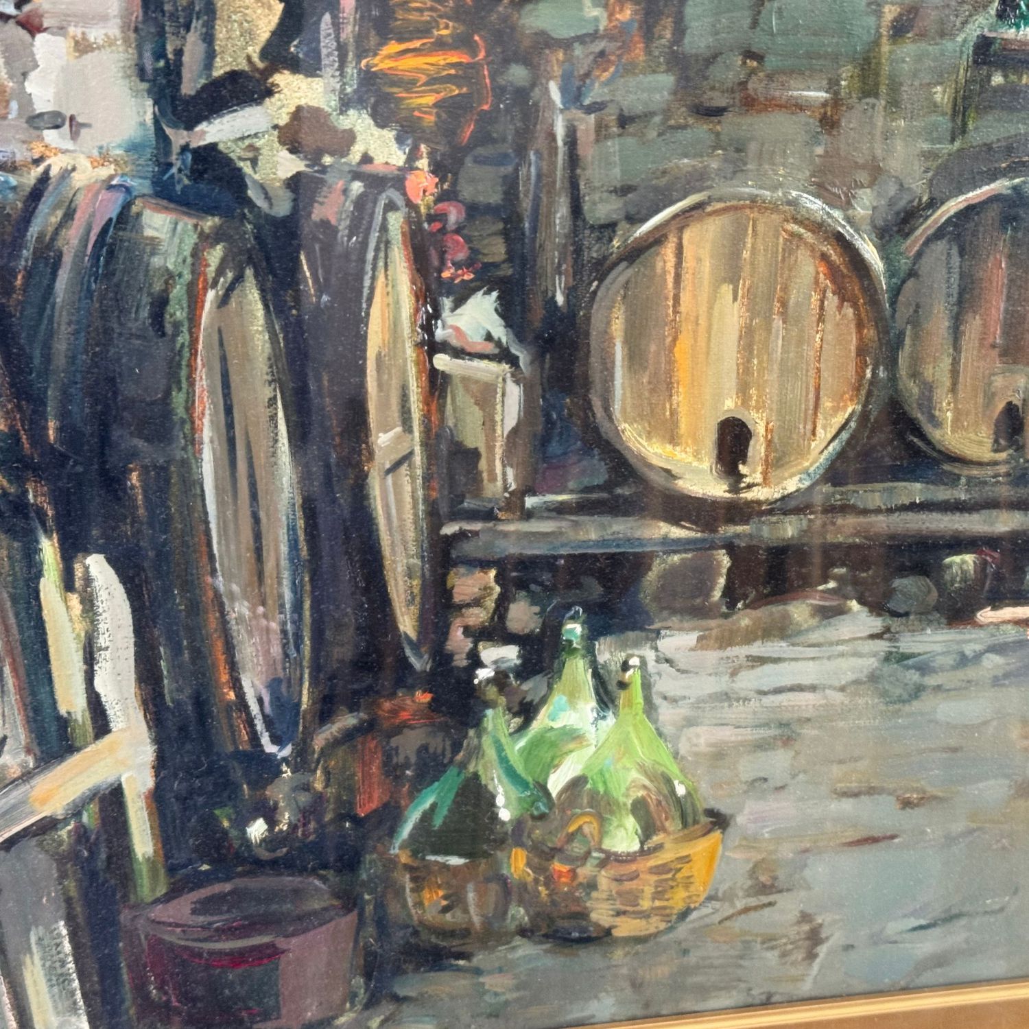 Dipinto olio su tela, periodo XX secolo scuola italiana, raffigurante Interno di cantina.