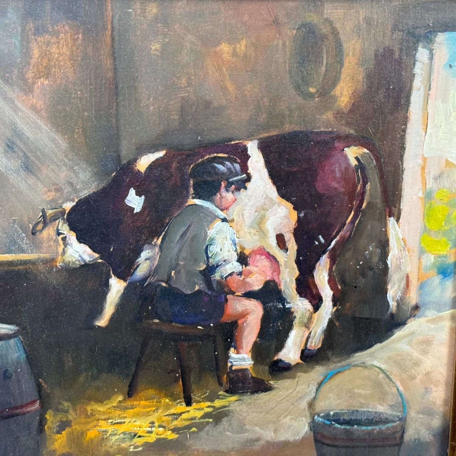 Dipinto olio su tavola, periodo XX secolo scuola Italiana, raffigurante "La mungitura".