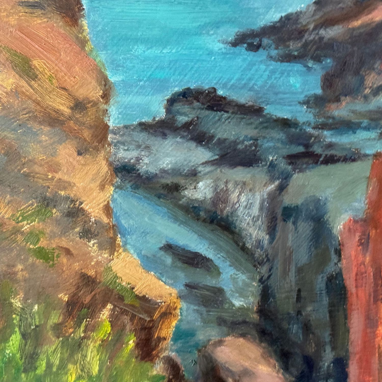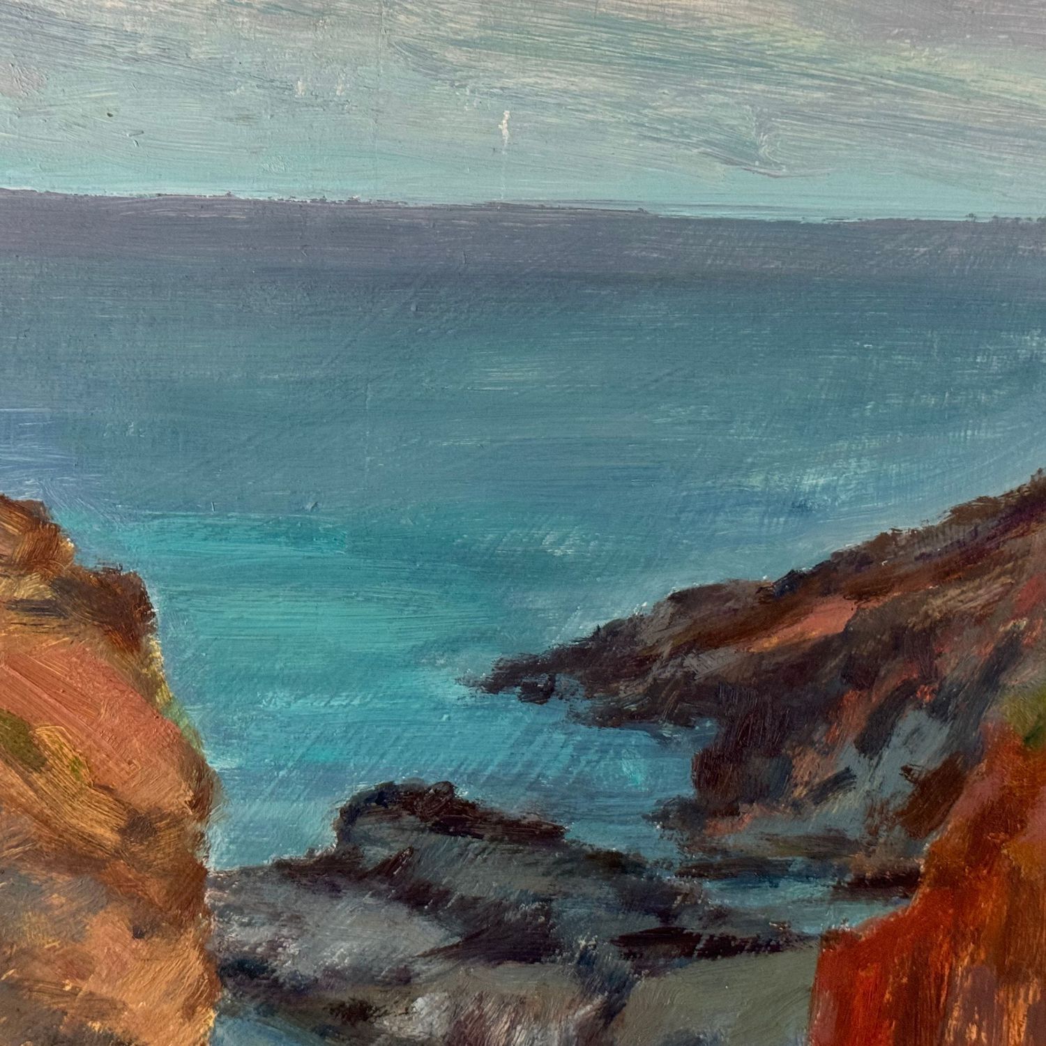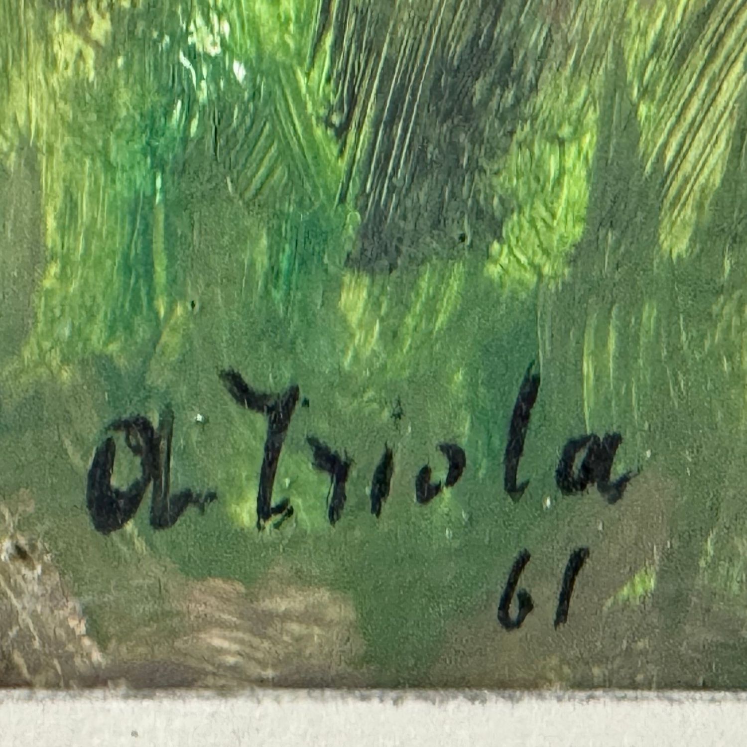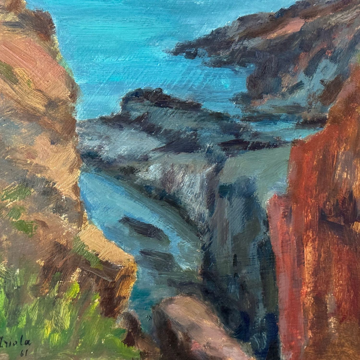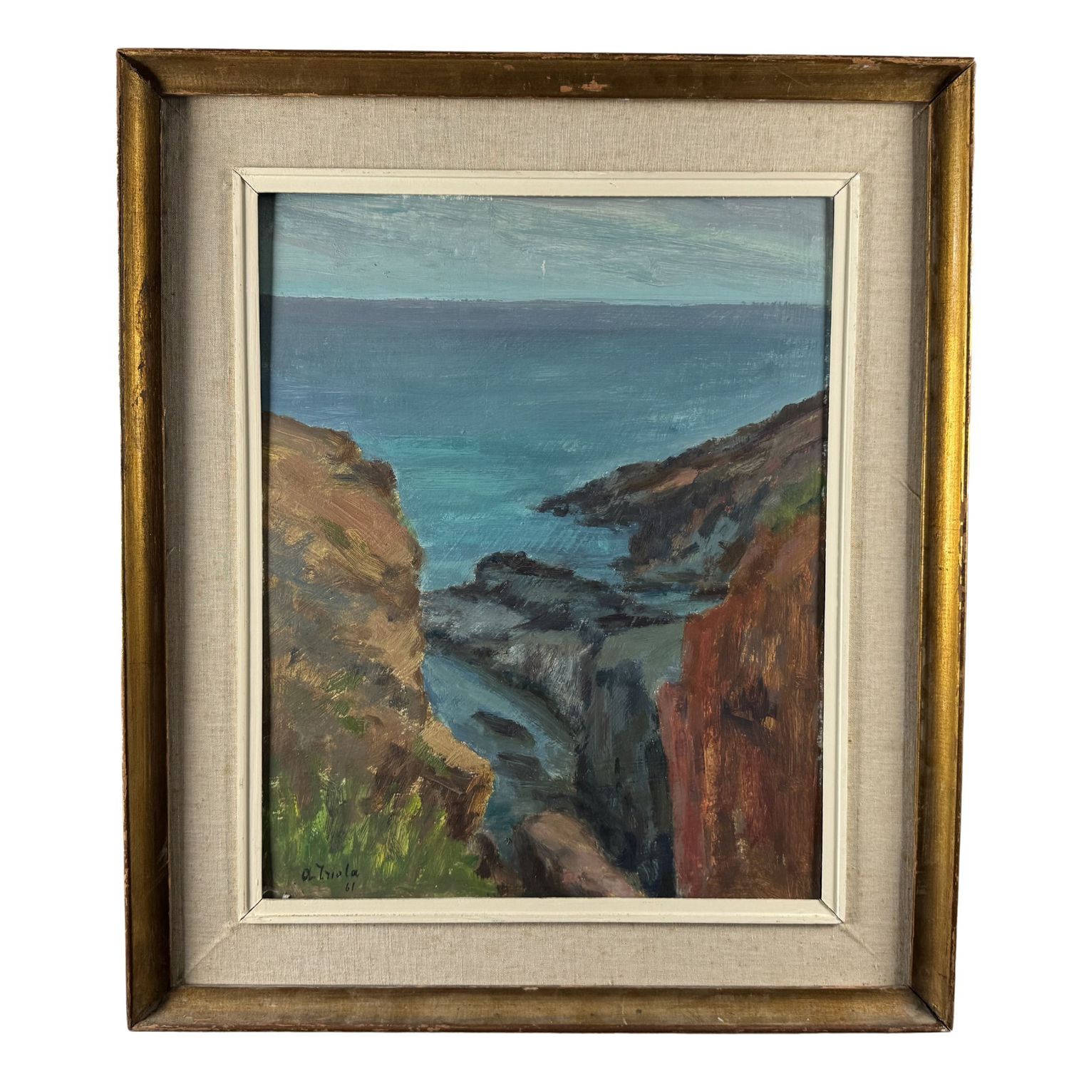 Dipinto olio su pannello, periodo XX secolo scuola Italiana, raffigurante Scogliera. Dimensioni interno cornice: 40x50 cm. Dimensioni compreso cornice: 57x66 cm. Reca firma in basso a sinistra A. Triola 1961. Opera in buone condizioni.