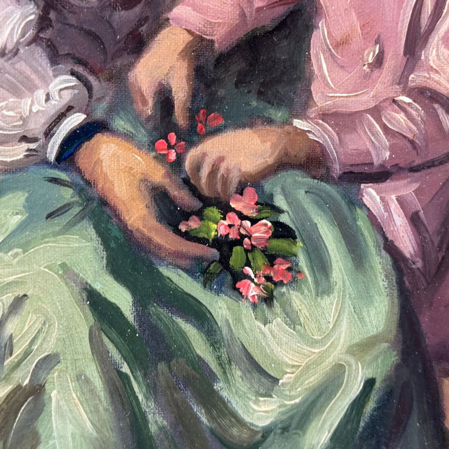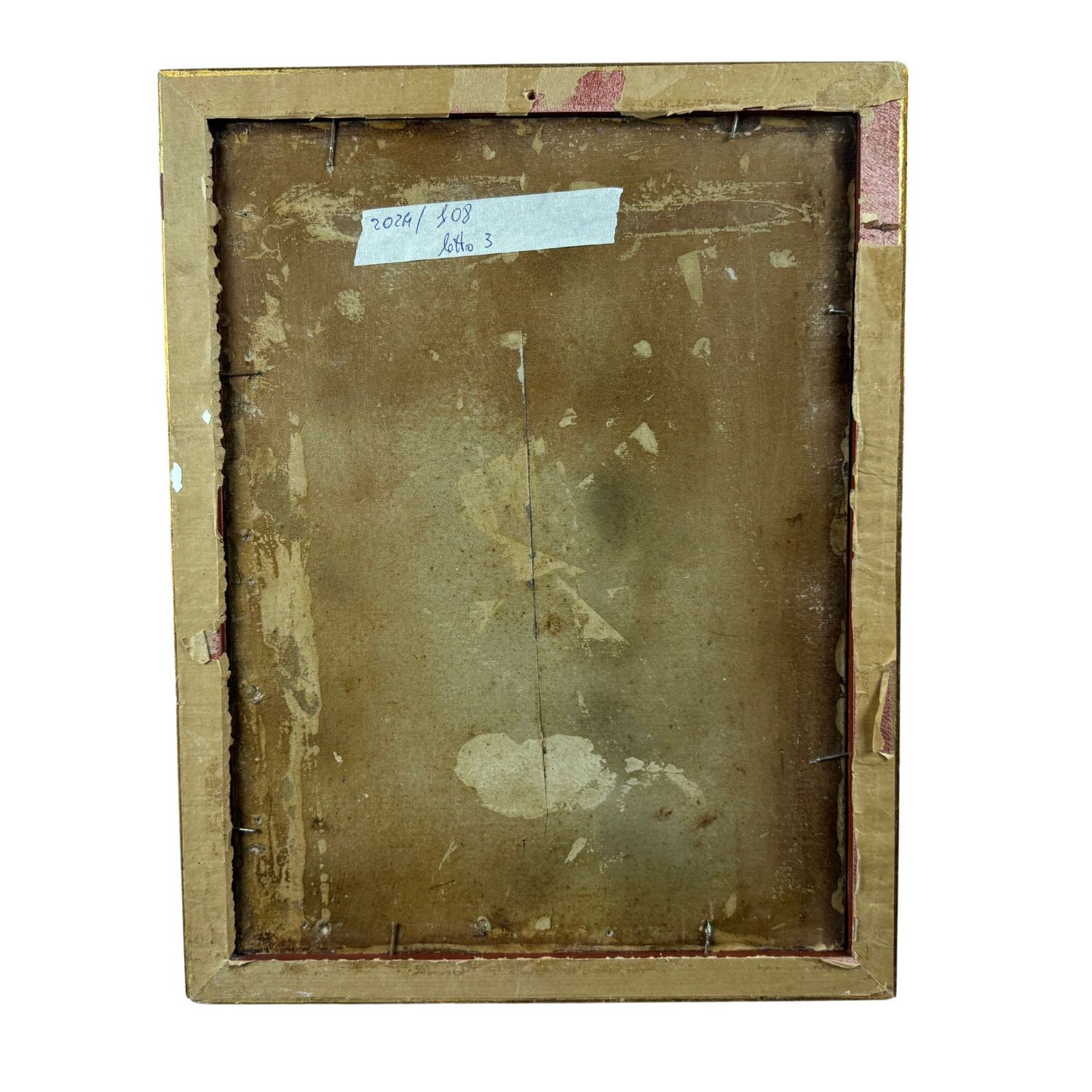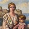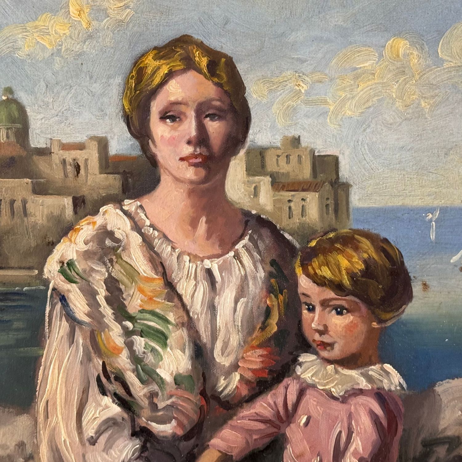 Dipinto olio su tela applicata su cartoncino, periodo XX secolo scuola Italiana, raffigurante Scena materna con paesaggio. Dimensioni interno cornice: 40x30 cm. Dimensioni compreso cornice: 35x45 cm. Reca firma in basso a destra di difficile lettura. Opera in buone condizioni.