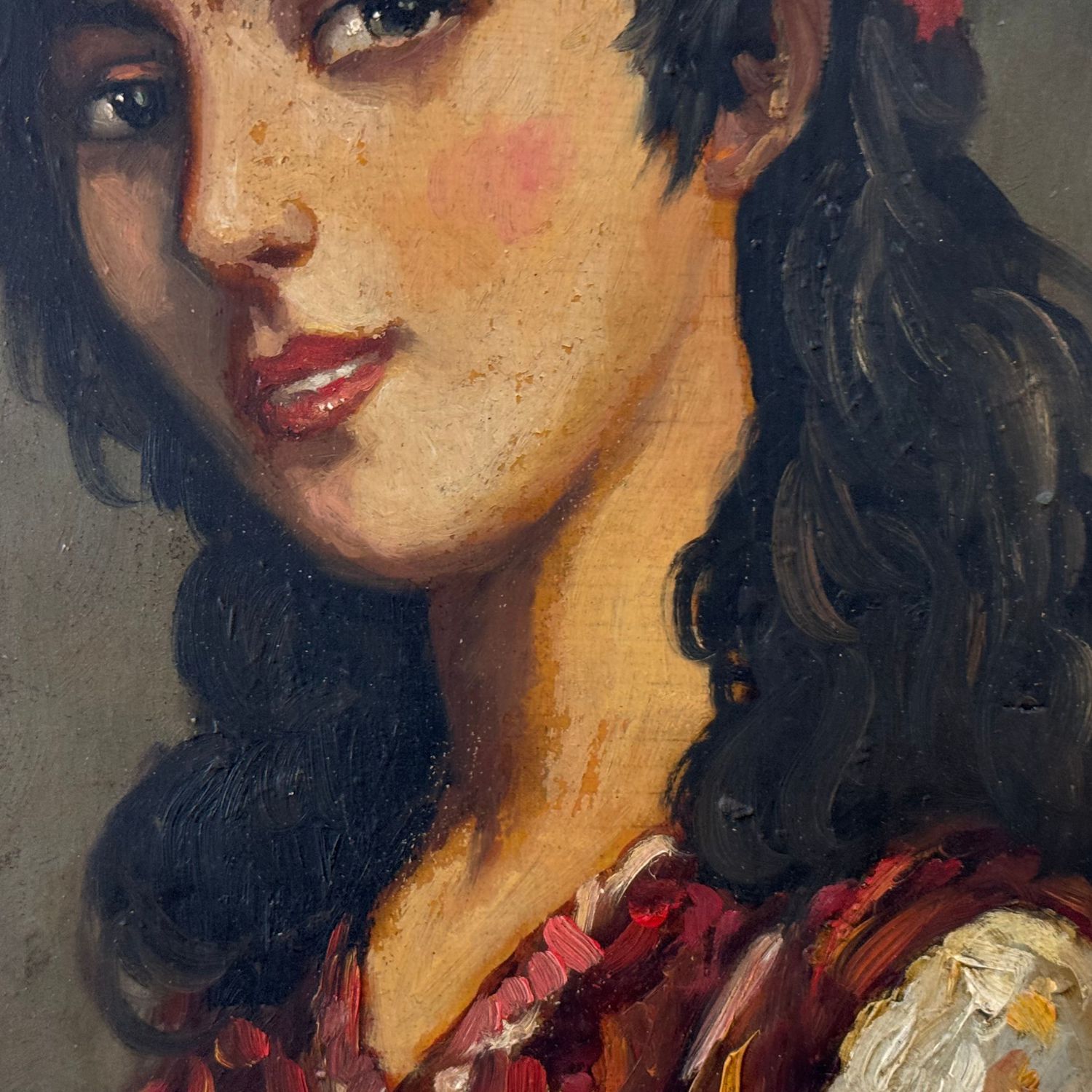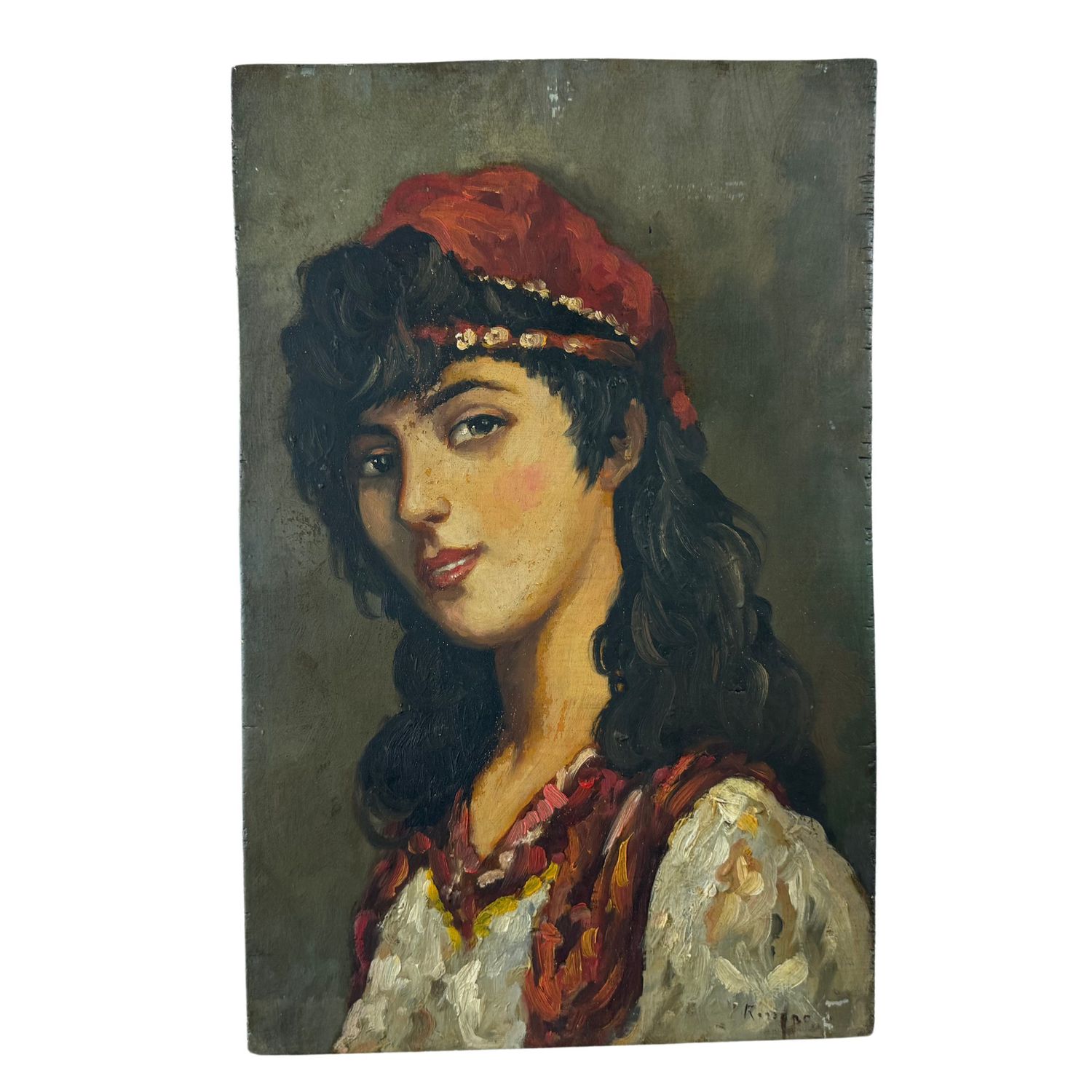 Dipinto olio su tavola, periodo XX secolo scuola italiana, raffigurante Ritratto di donna. Dimensioni: 30x46 cm. Reca firma in basso a destra di difficile lettura. Opera in buone condizioni.