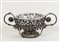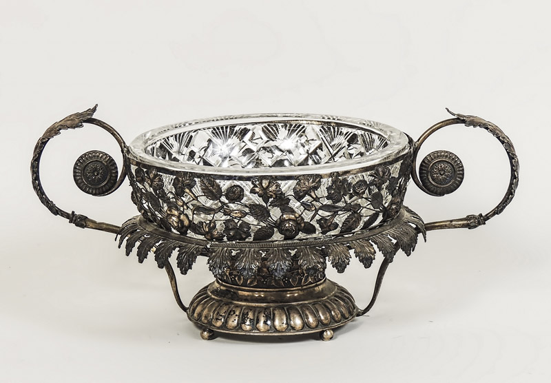 CENTROTAVOLA IN ARGENTO - SILVER CENTREPIECE XIX secolo - 19th Century realizzato come un cestino con bordo sbalzato e traforato con fiori intreacciati, due prese con motivi vegetali e rosoni, su base baccellata su piedini a palla, con coppa in cristallo non pertinente gr 785