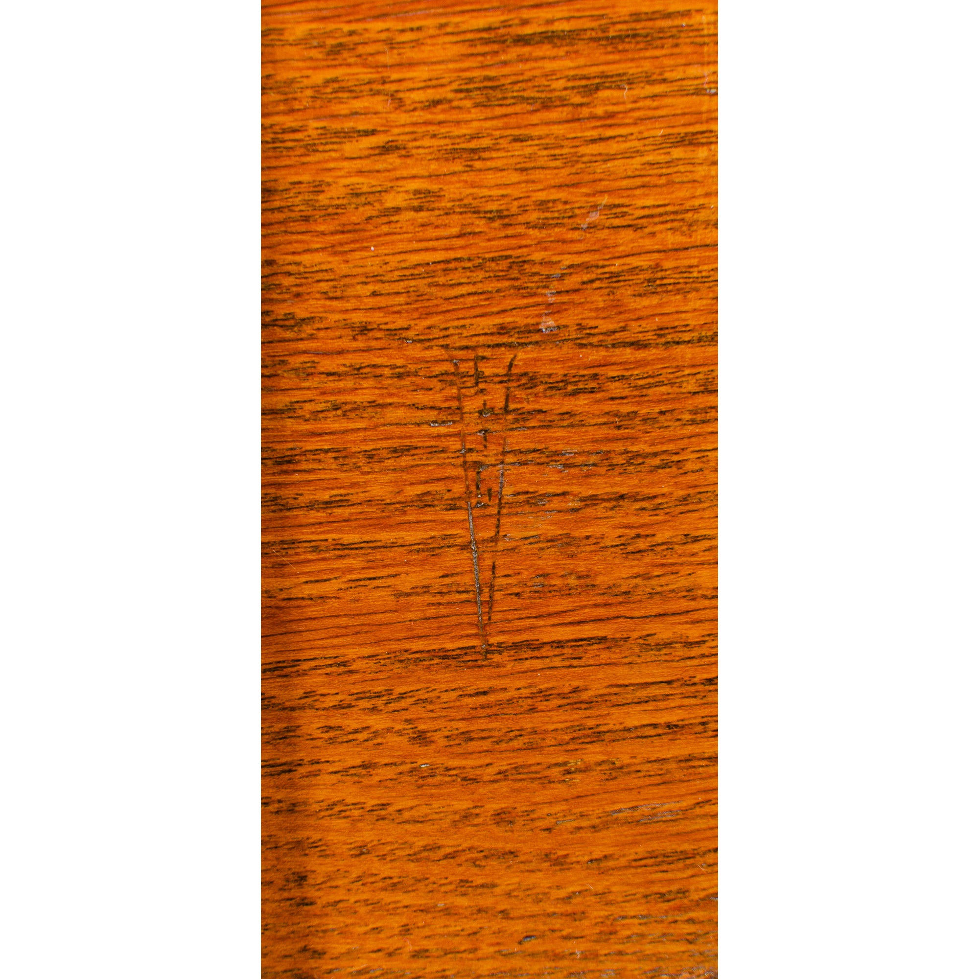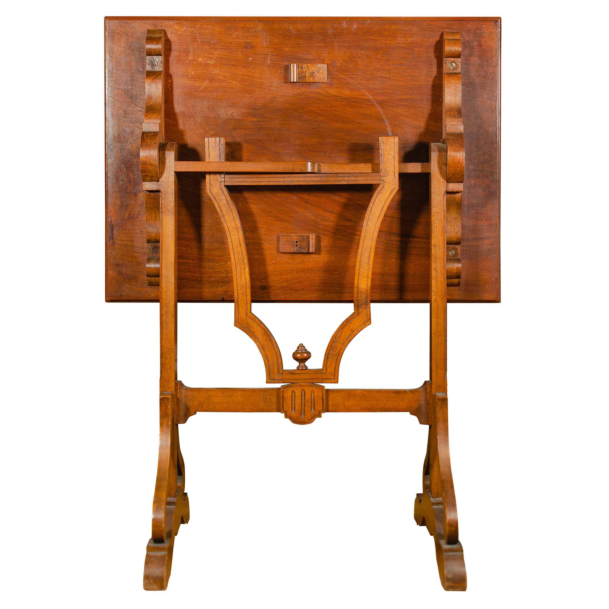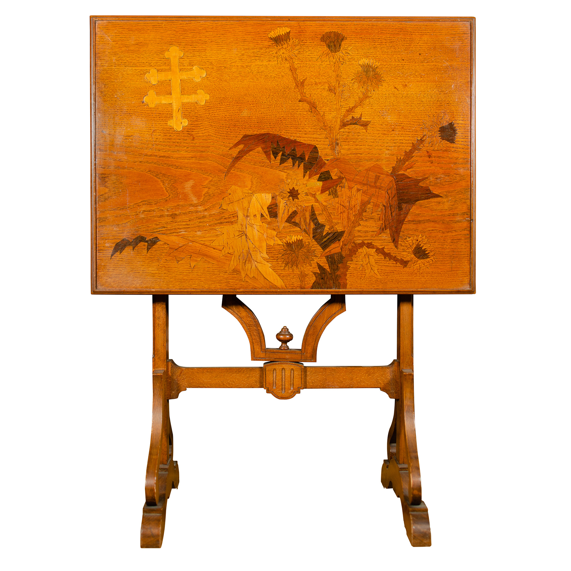 Tavolino da tè con piano reclinabile; il piano decorato a marqueterie in legni vari con raffigurazioni di cardi e Croce di Lorena, su piedi a forma di lira e supporto centrale rotabile, 1900 circa, siglato EG e Croce di Lorena; dimensioni: cm 72x76x51,5.
