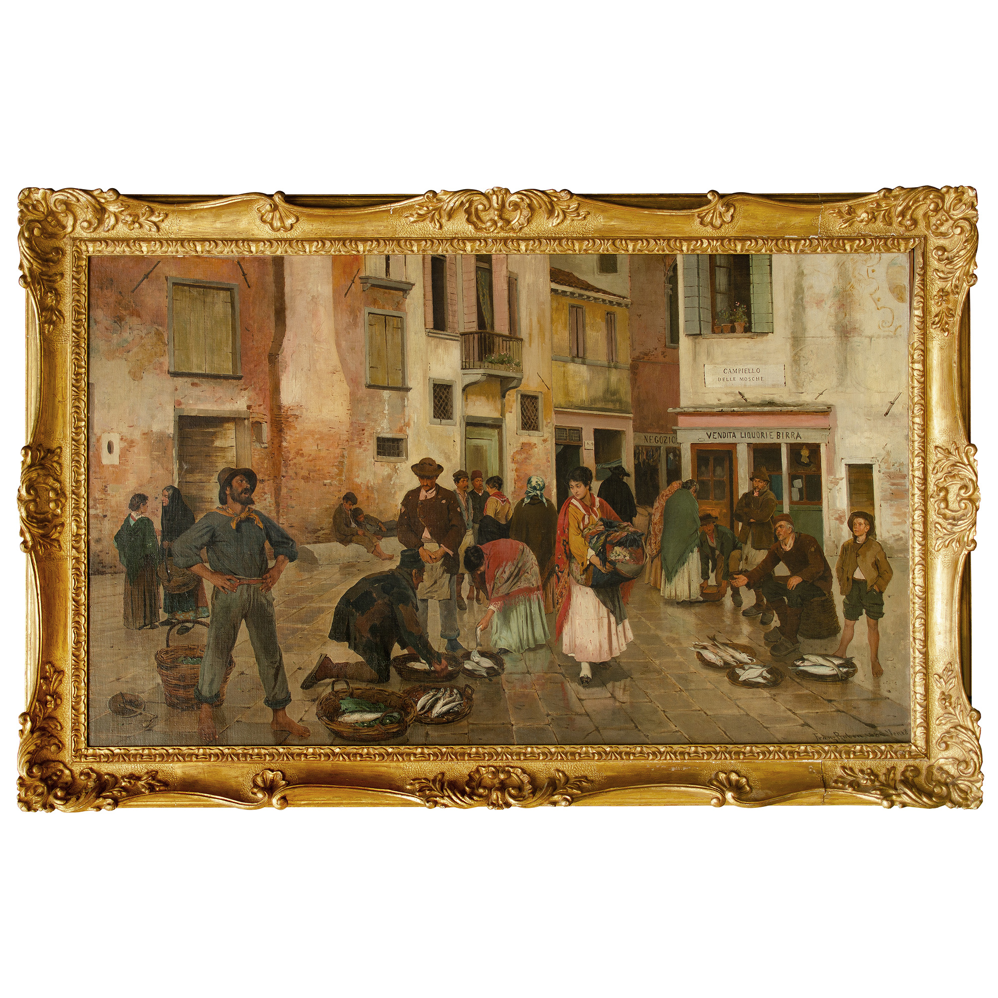 Un altro pittore estremamente interessato alla resa degli abiti tradizionali della sua epoca fu Franz Leo Ruben. Originario di Praga, dopo aver frequentato l’Accademia di Belle Arti di Vienna, aveva visitato Roma per poi stabilirsi fino allo scoppio della Prima Guerra Mondiale a Venezia. Guardando alcune delle sue opere realizzate a Venezia, di cui quella presentata è un mirabile esempio, si nota subito come l’attenzione sia posta sulla varietà dei tessuti indossati. In particolar modo saltano all’occhio gli scialli: questo capo, presente nella tradizione veneta da molti secoli, ebbe un importante revival a fine Settecento, quando Napoleone ne portò uno di ritorno dalla campagna d’Egitto in dono a Giuseppina. Lo scialle era simbolo di Venezia quanto il leone di San Marco: era diffuso in tutti i ceti sociali e veniva indossato sia sopra il capo che sulle spalle, per proteggersi dal vento e dall’umidità della città lagunare. Il più diffuso era quello completamente nero (si vedano le due figure sulla sinistra) ma erano di gran moda anche quelli ricamati sul bordo inferiore, vicino le frange, le quali a loro volta erano più corte nella versione di uso quotidiano e più lunghe in quella tradizionale. Tale elemento decorativo è protagonista anche di un simpatico aneddoto che ha a che fare con il termine “attaccare bottone”: pare che le giovani veneziane, civettando con il ragazzo a cui erano interessate, si gettavano lo scialle sulle spalle, lasciando impigliare volutamente le frange sui bottoni degli indumenti del potenziale “moroso” per creare un malizioso pretesto.