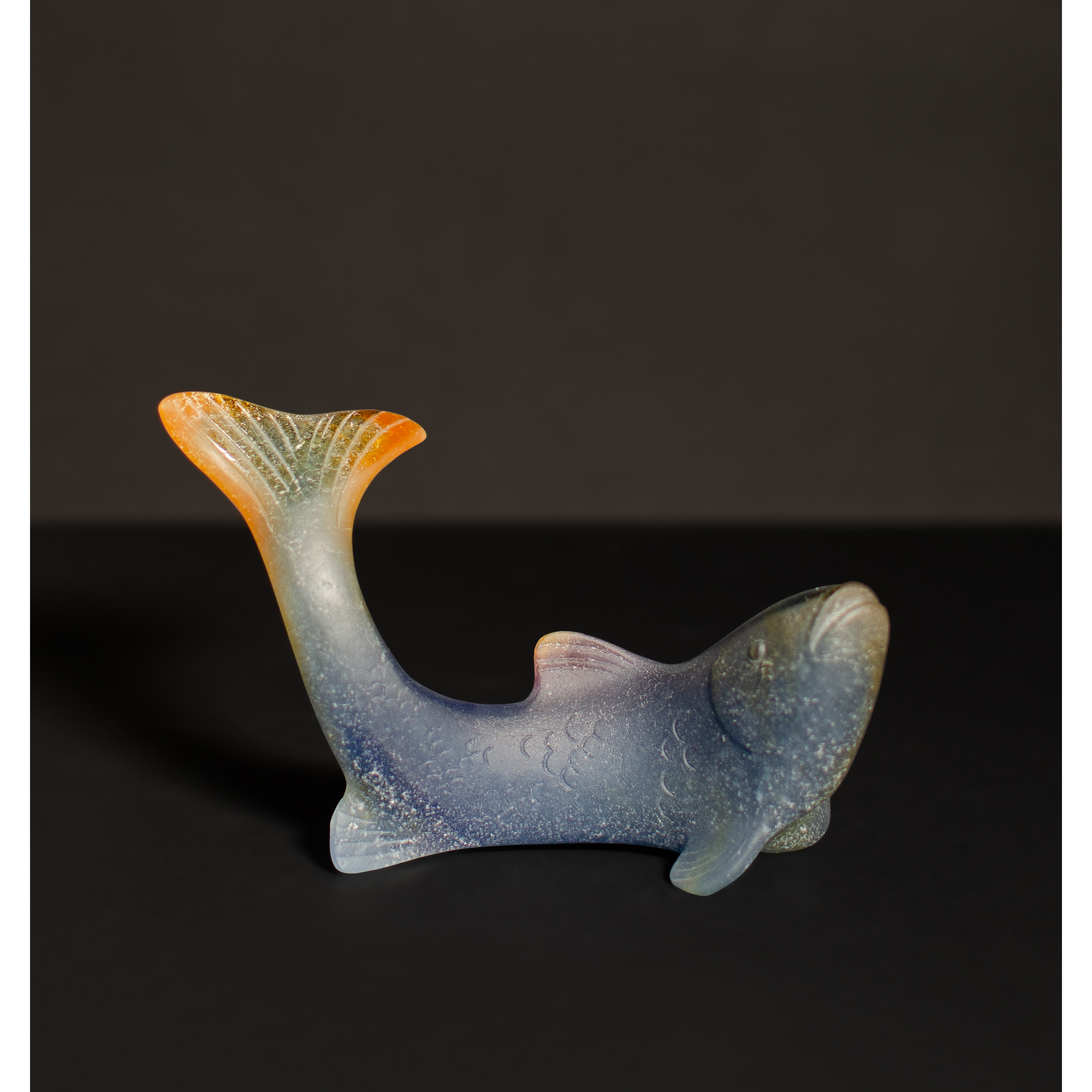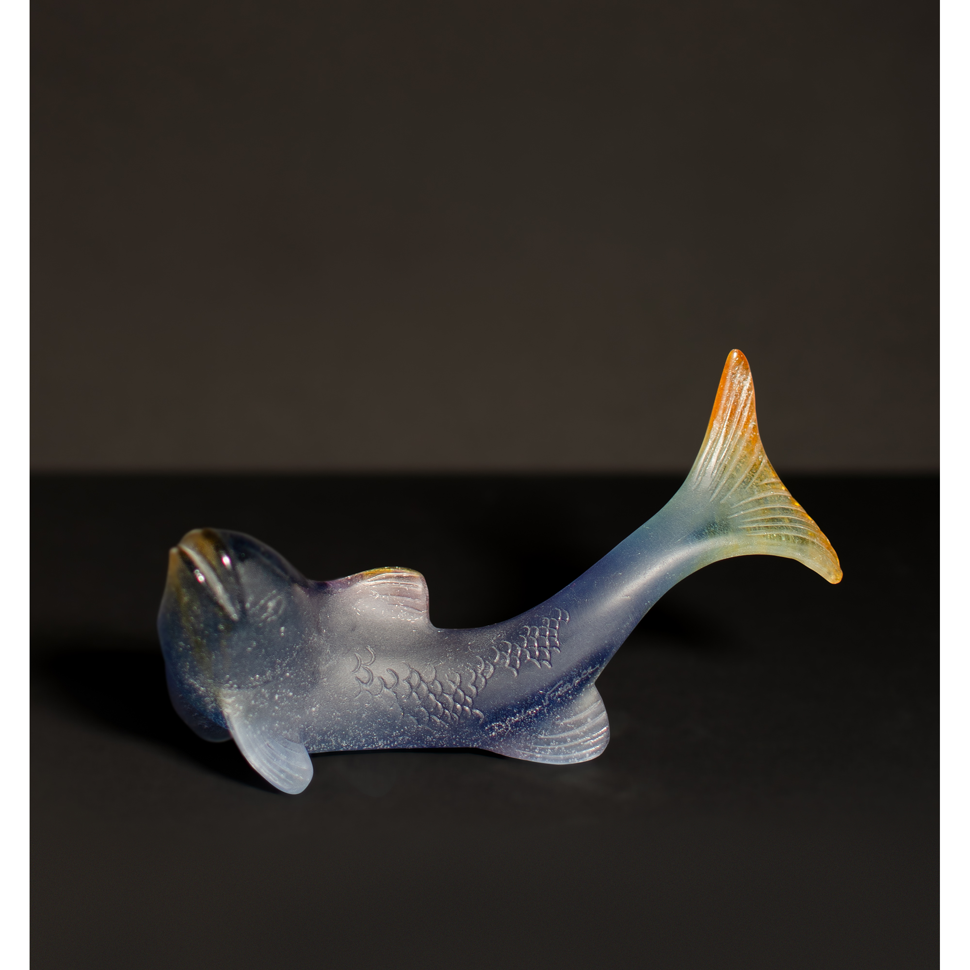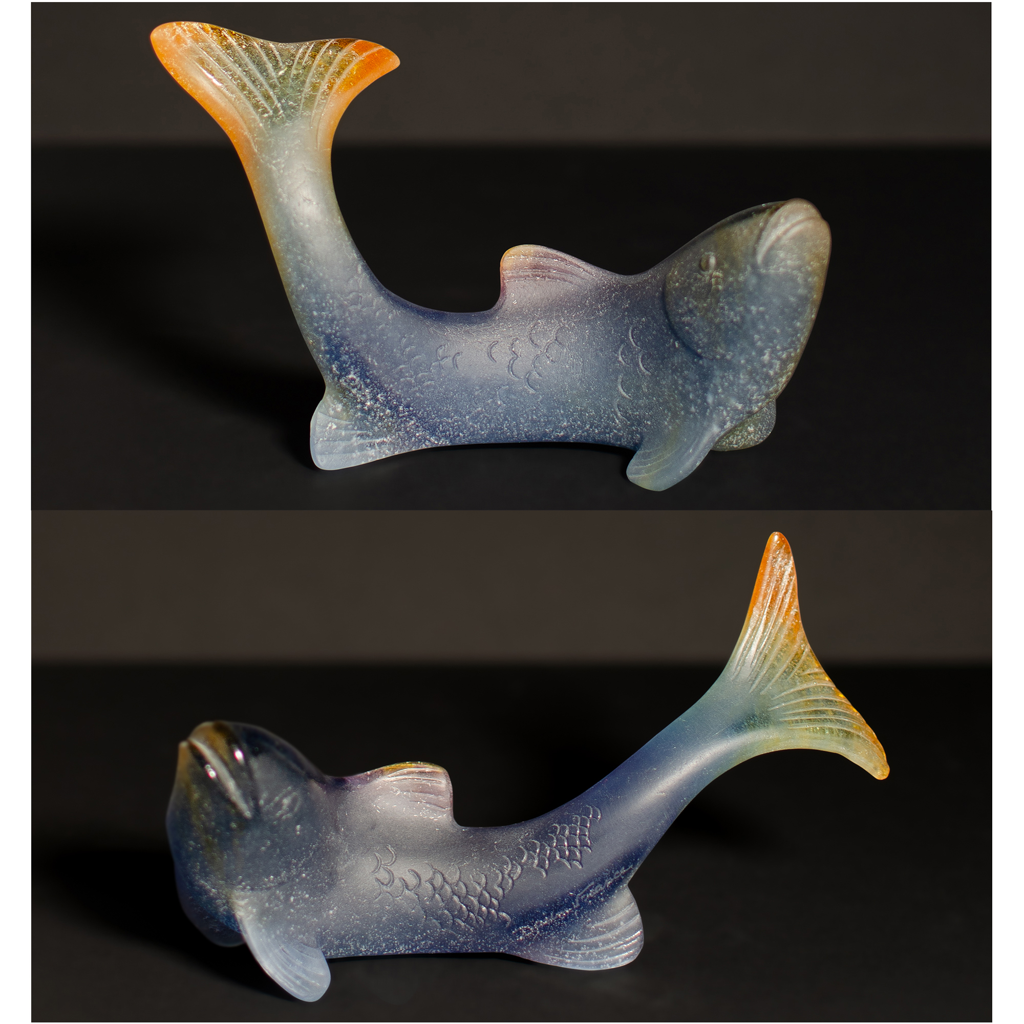 Lotto composto da due pesci in pasta di vetro, lunghezze cm 17, cm 20, in custodia originale di cartone.