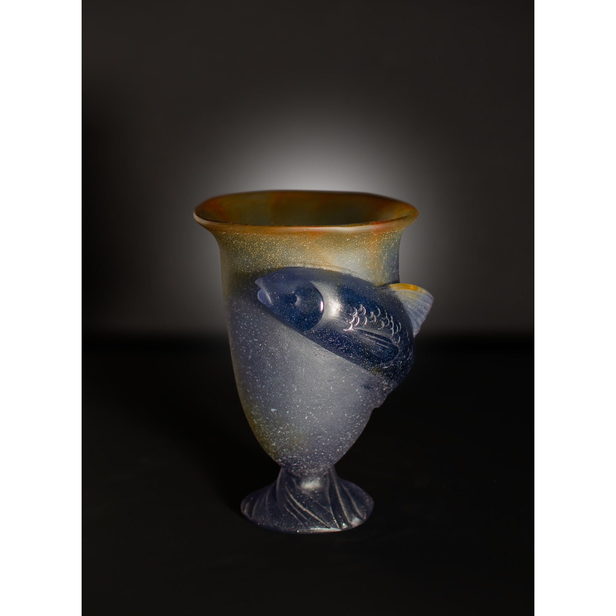 Vaso in pasta di vetro con decorazione applicata a guisa di pesce; altezza cm 18, in scatola di cartone originale.