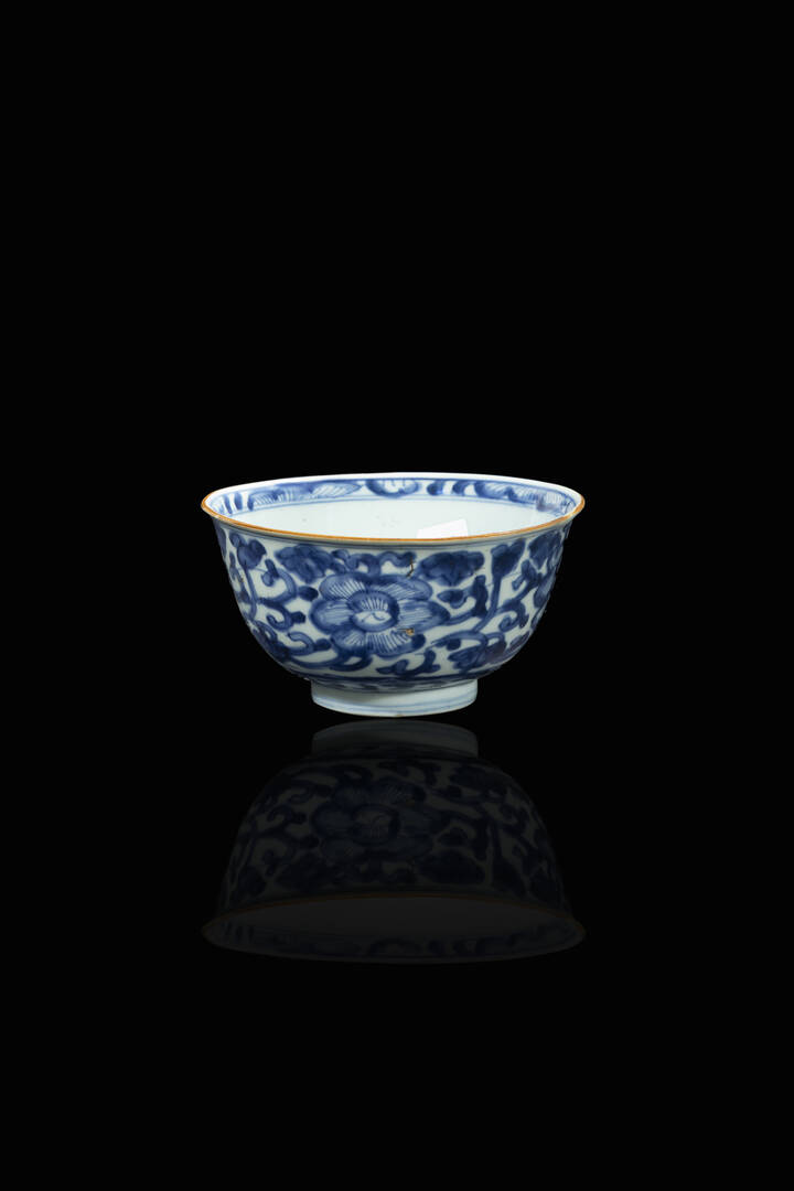 Ciotola in porcellana bianca e blu dipinta a motivi floreali, Cina, dinastia Qing, XIX sec.