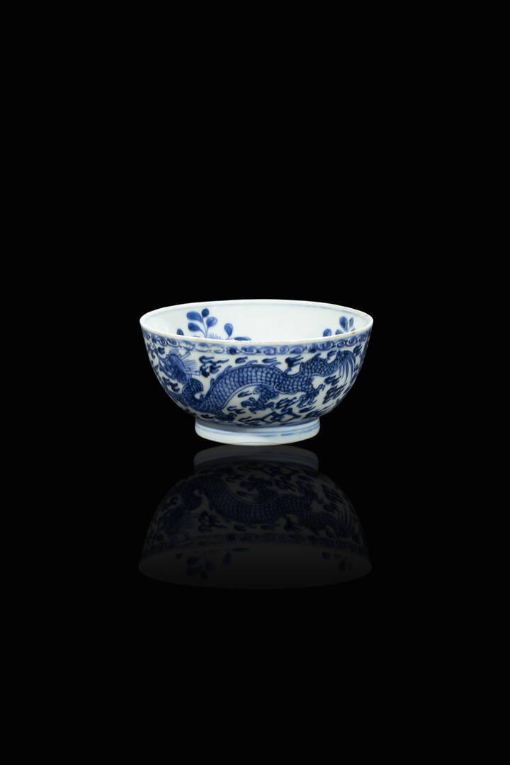 Ciotola in porcellana bianca e blu dipinta con draghi, Cina, Repubblica, XX sec.