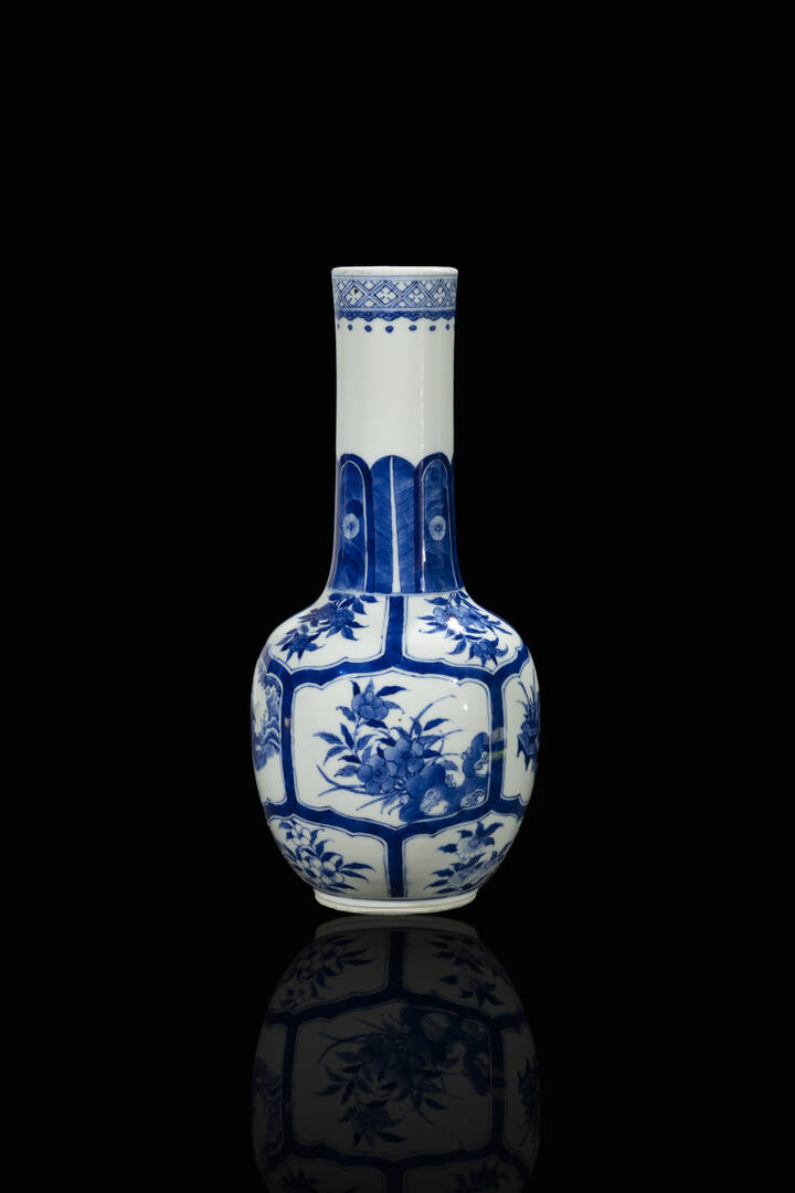 Vaso in porcellana bianca e blu con decori floreali e personaggi entro riserve, Cina, dinastia Qing, XIX sec.