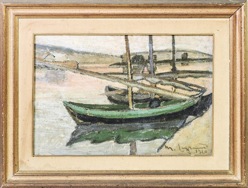 MARCELLE EMILIE LEGRAND (1888-1983) Paesaggio fluviale con barche - River Landscape with Boats olio su tela - oil on canvas, firmato e datato 1920, in cornice cm 39x56