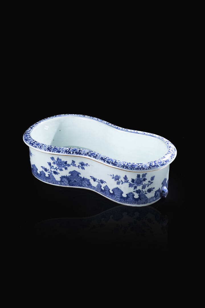 Bidet in porcellana bianca e blu con decori floreali, Cina, dinastia Qing, XVIII sec