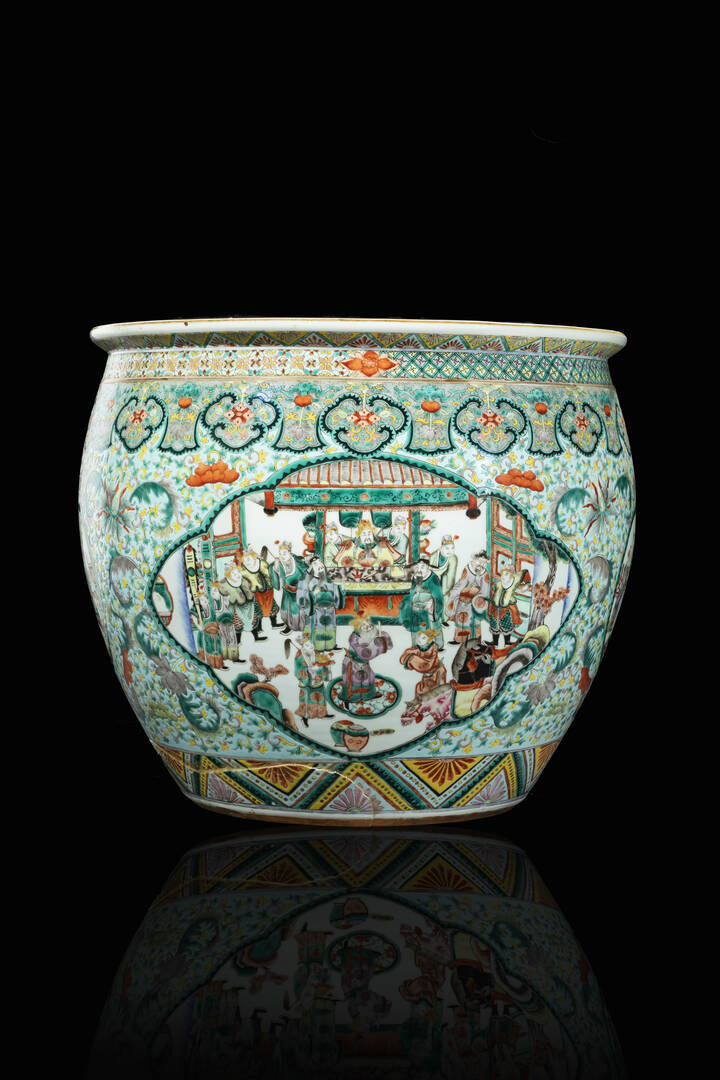 Vasca in porcellana Famiglia Verde, decorata con scene di corte entro riserve, Cina, Repubblica, XX sec.