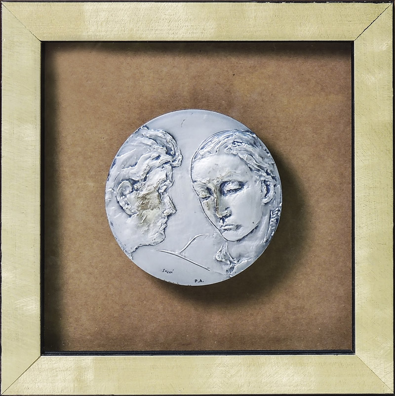 ALBERTO SUGHI (1928-2012) Figure - Figure bassorilievo circolare su metallo - round metal low-relief, prova d'autore, firmato, in cornice diam cm 10