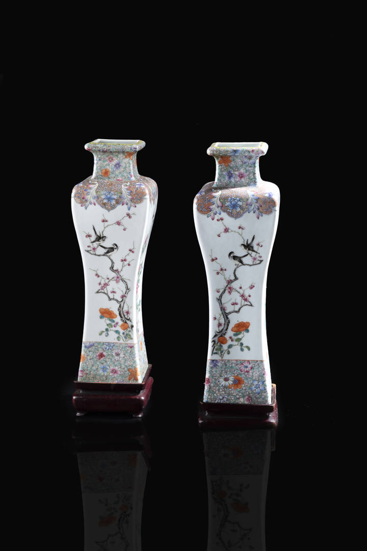 Coppia di vasi in porcellana Famiglia Rosa con decori floreali e ucceli sui rami, Cina, dinastia Qing, XIX sec