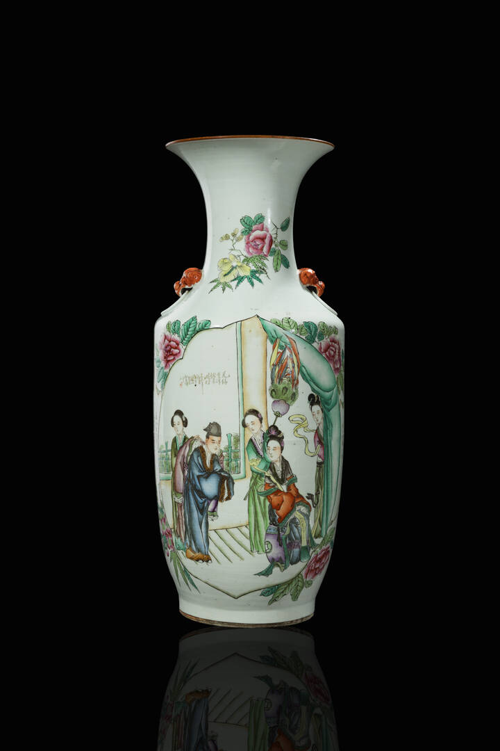 Vaso in porcellana Famiglia Rosa decorato con scena di corte e iscrizioni, Cina, dinastia Qing, XIX sec
