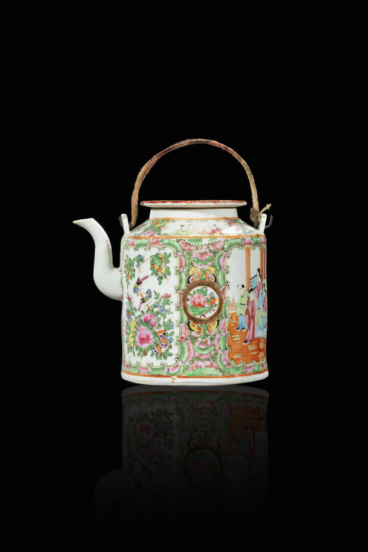 Teiera in porcellana Canton decorata con decori floreali e scene di corte entro riserve, Cina, XIX sec.