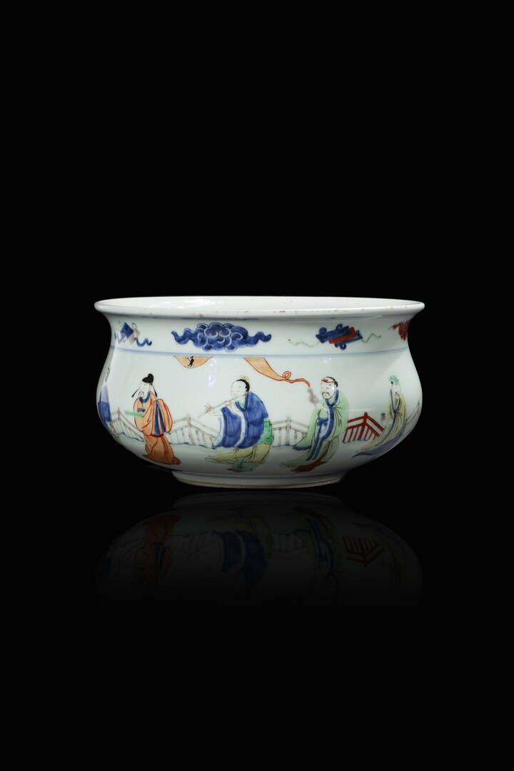 Bacile in porcellana Wucai dipinta con personaggi, Cina, dinastia Qing, XIX sec.