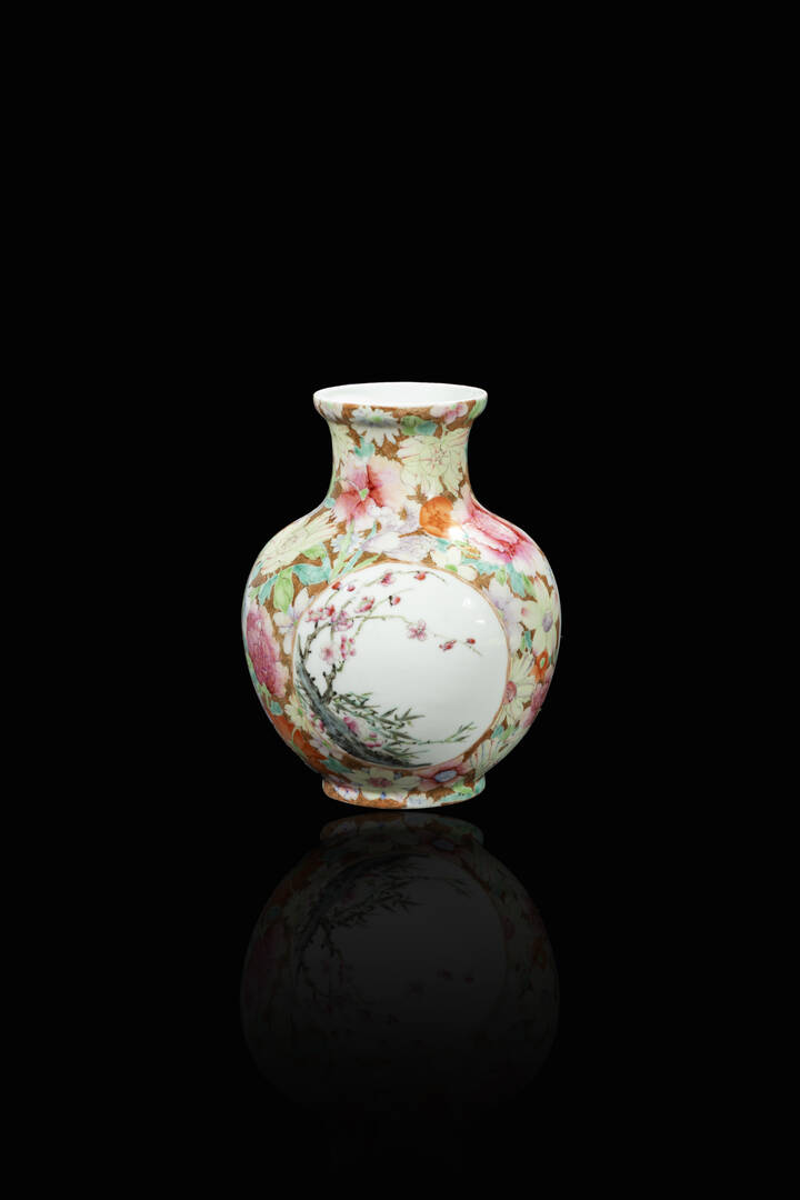 Vaso in porcellana Millefleurs con decori floreali entro riserve, Cina, Repubblica, XX sec.