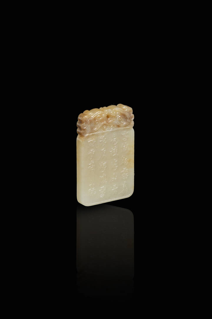 Placca in giada celadon con rusted incisa con pescatore e iscrizioni, Cina, dinastia Qing, XIX sec
