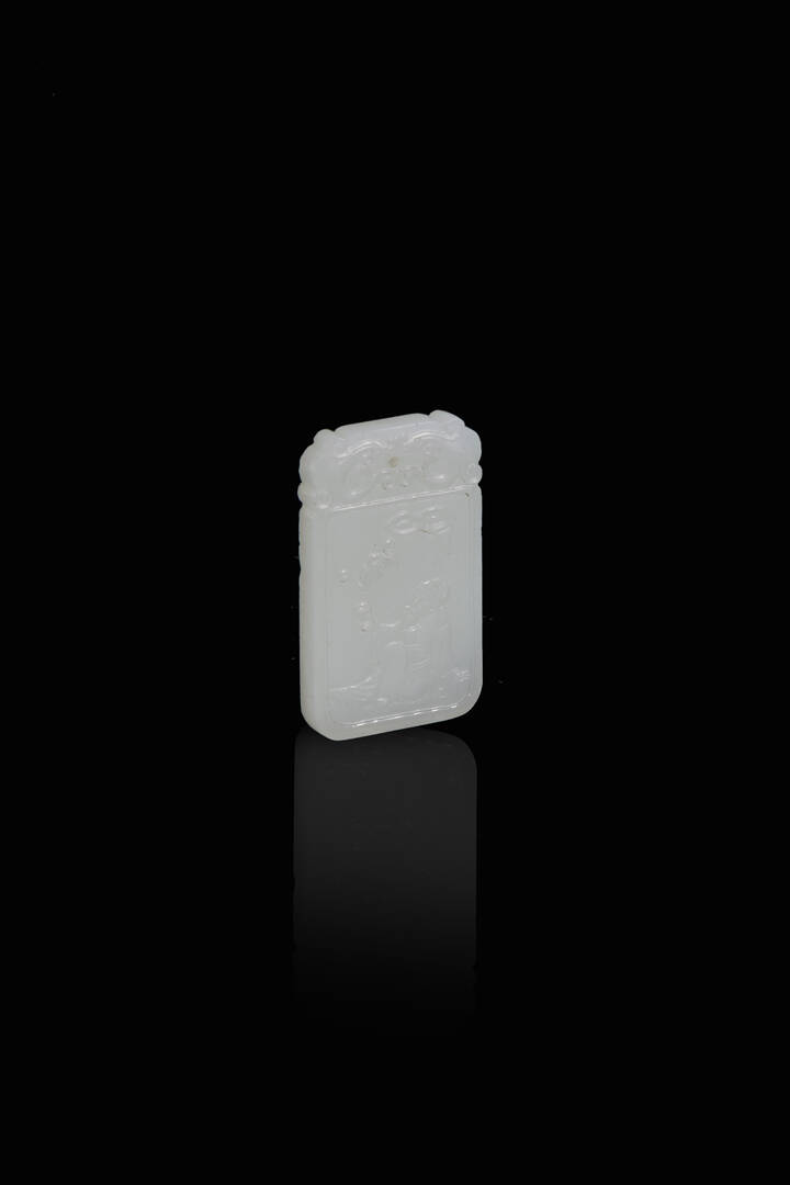 Placca in giada bianca incisa con iscrizioni e saggio, Cina, Repubblica, XX sec.