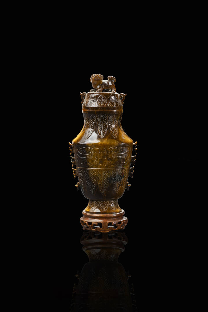 Vasetto in dente di tigre con decori floreali sormontato da cane di Pho, Cina, Repubblica, XX sec.