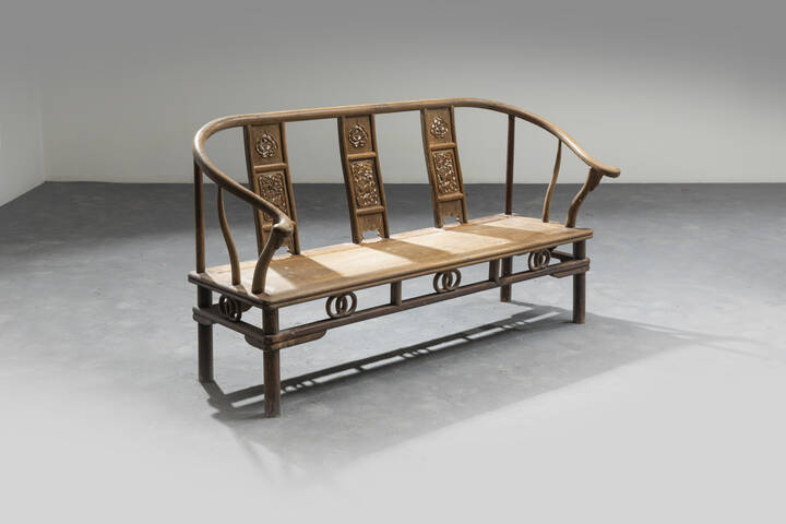 Panca in legno di Yingzimu con schienale decorato con draghi entro riserve, Cina, dinastia Quing, XIX sec