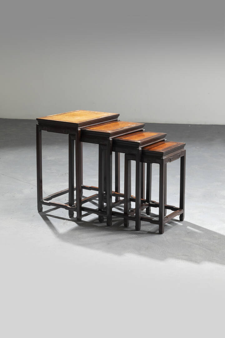 Set di quattro tavolini impilabili con base in radica, Cina, Repubblica, XX sec.