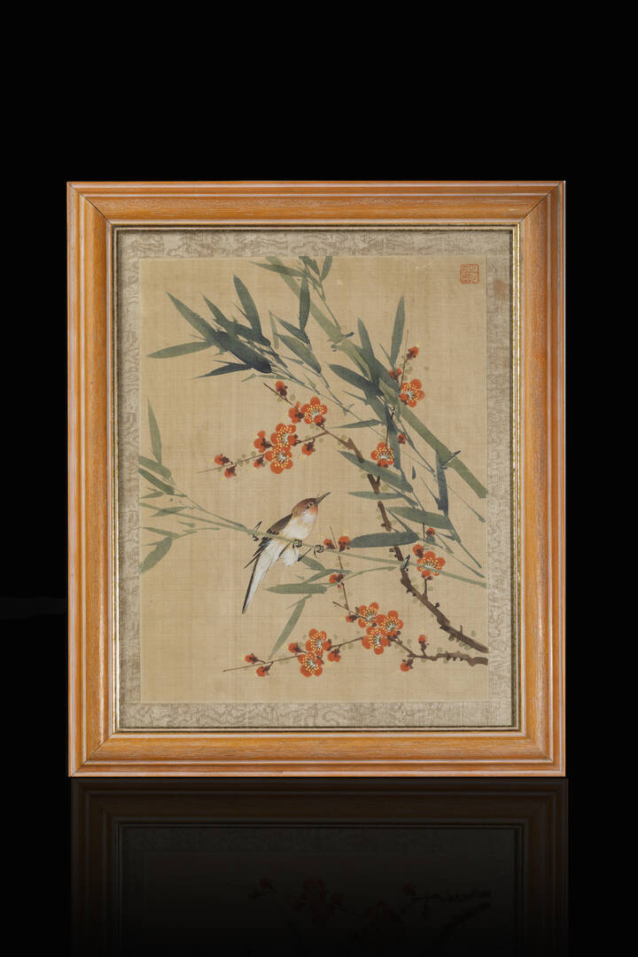 Dipinto su seta rappresentante uccello sui rami con fiori, Cina, Repubblica, XX sec.