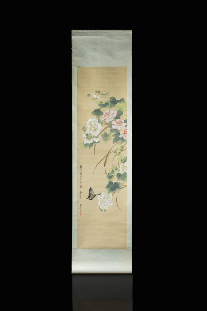 Scroll dipinto su seta decorato con fiori e farfalla, Cina, Repubblica, XX sec.