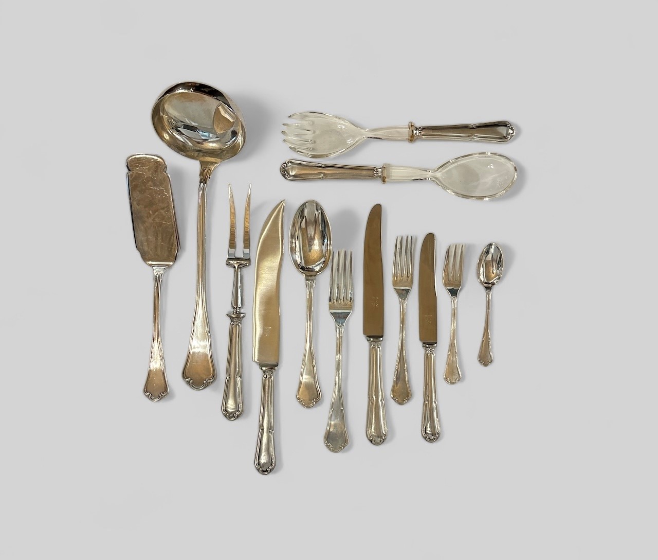composto da: 12 cucchiai, 12 forchette, 12 coltelli, 12 forchette da frutta, 12 coltelli da frutta, 12 forchette da dessert, 12 cucchiaini, paletta da dessert, mestolo, posate da insalata e posate da servizio per la carne. Peso totale 5.354 gr