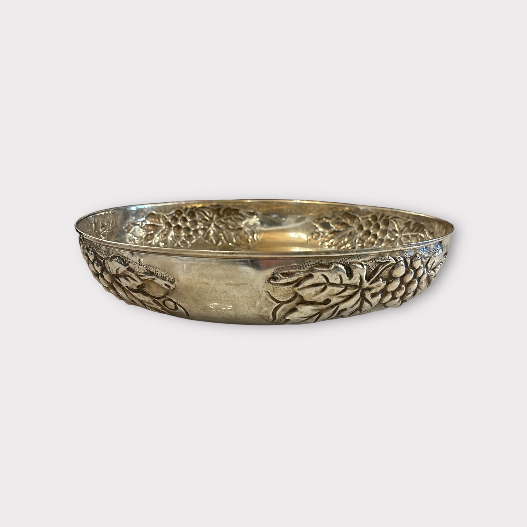 corpo circolare con decorazione di frutta e foglie in rilievo, reca al bordo punzoni incisi un Leone e simbolo grafico, punzoni 800, gr. 666
