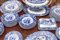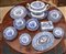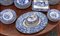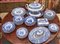 In porcellana blu e bianca. Composto da: una grande zuppiera con piatto (h. 32 x 48 cm), 2 piatti da portata rotondi (diametro 40 cm, 2 piatti da portata rotondi (diametro 36,5 cm), 2 piattina portata (diametro 34,5 cm), un piatto da portata ovale (L 42 cm), un piatto da portata ovale (L. 36,5 cm), un piatto da portata ovale (L. 31,5 cm), una salsiera con cucchiaio, una legumiera rettangolare con coperchio (L. 25 cm), 57 piatti piani, 12 piatti fondi, 12 piatti da dessert (diametro 20,5 cm), 12 piatti da frutta (diametro 18,5 cm).