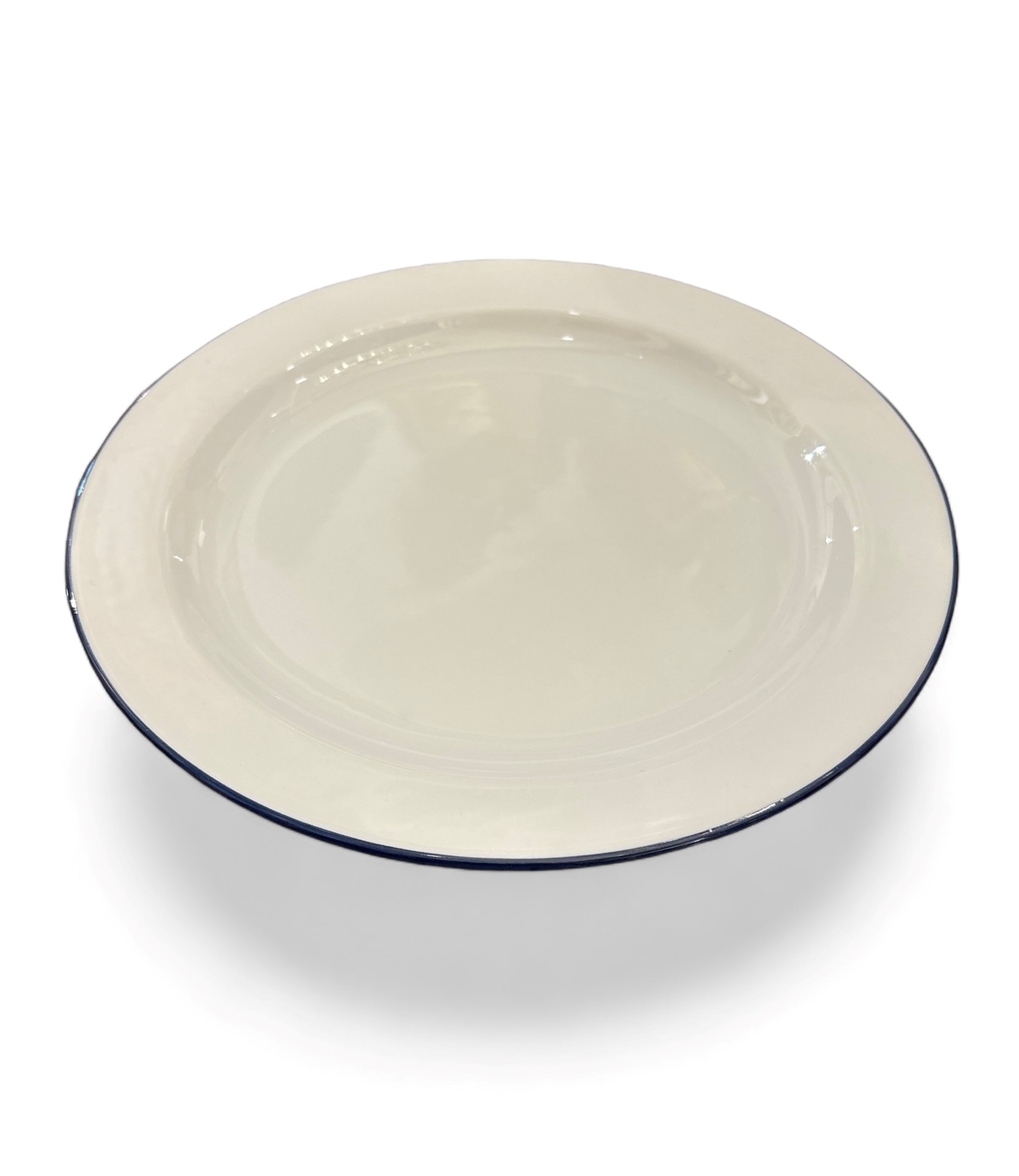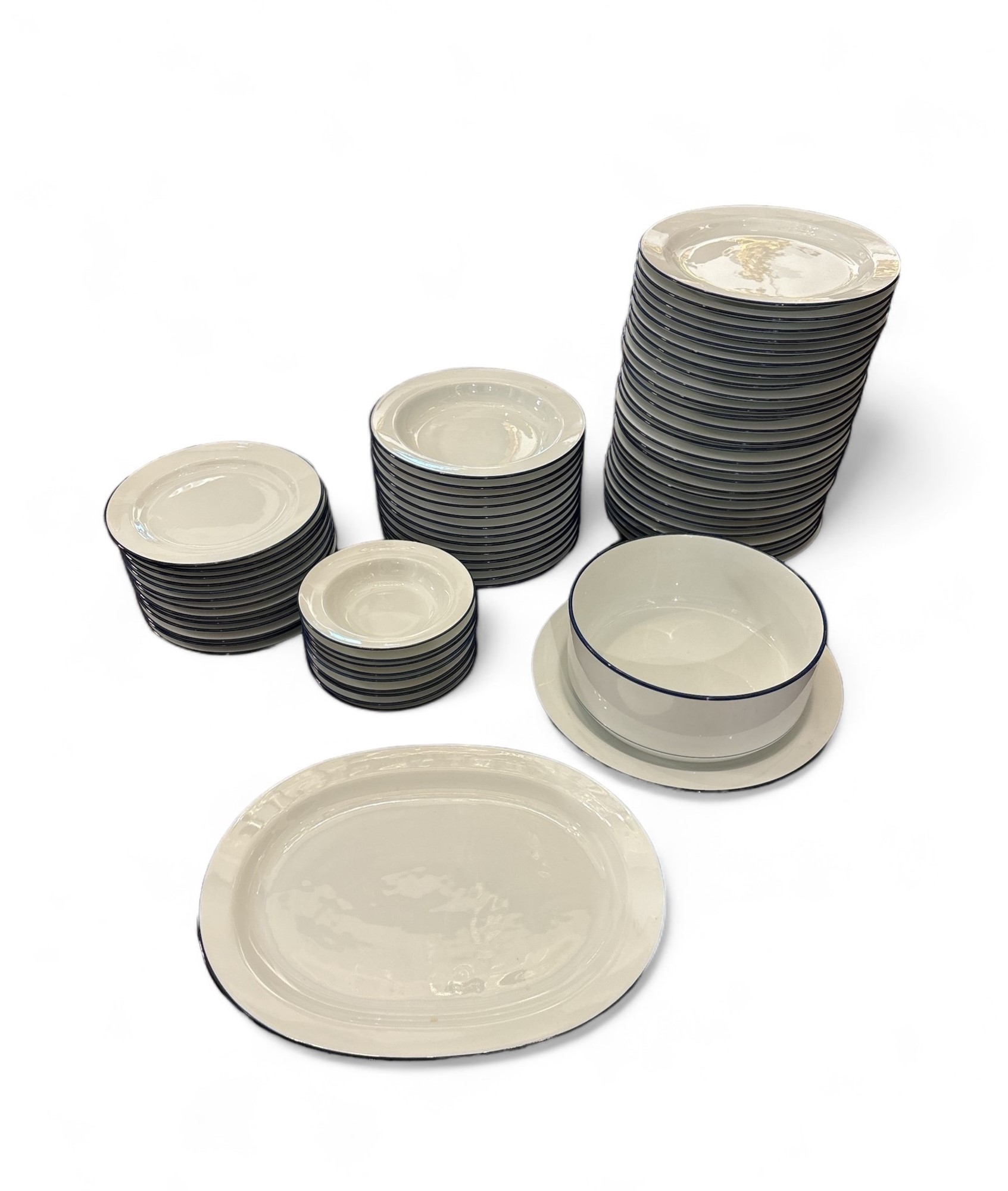 Bianco con bordo esterno blu. Composto da 27 piatti piani, 13 piatti fondi, 13 piatti da dessert, 9 coppette, 1 vassoio (larghezza 34,5 cm), 1 piatto da portata rotondo (diametro 28 cm), una grande ciotola ( diametro 21,5 cm). Un piatto piano sbeccato.
