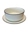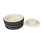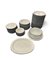 Bianco con bordo esterno blu. Composto da 27 piatti piani, 13 piatti fondi, 13 piatti da dessert, 9 coppette, 1 vassoio (larghezza 34,5 cm), 1 piatto da portata rotondo (diametro 28 cm), una grande ciotola ( diametro 21,5 cm). Un piatto piano sbeccato.