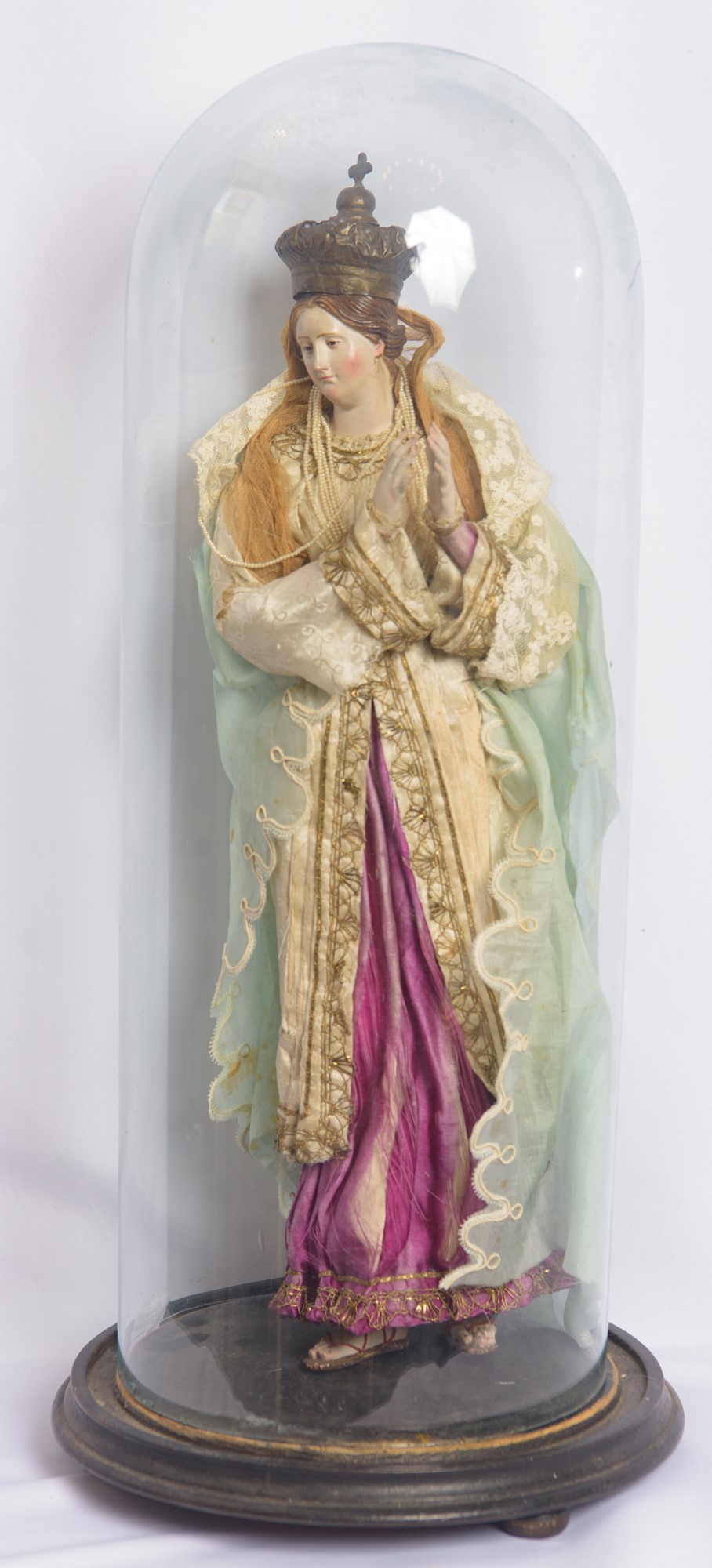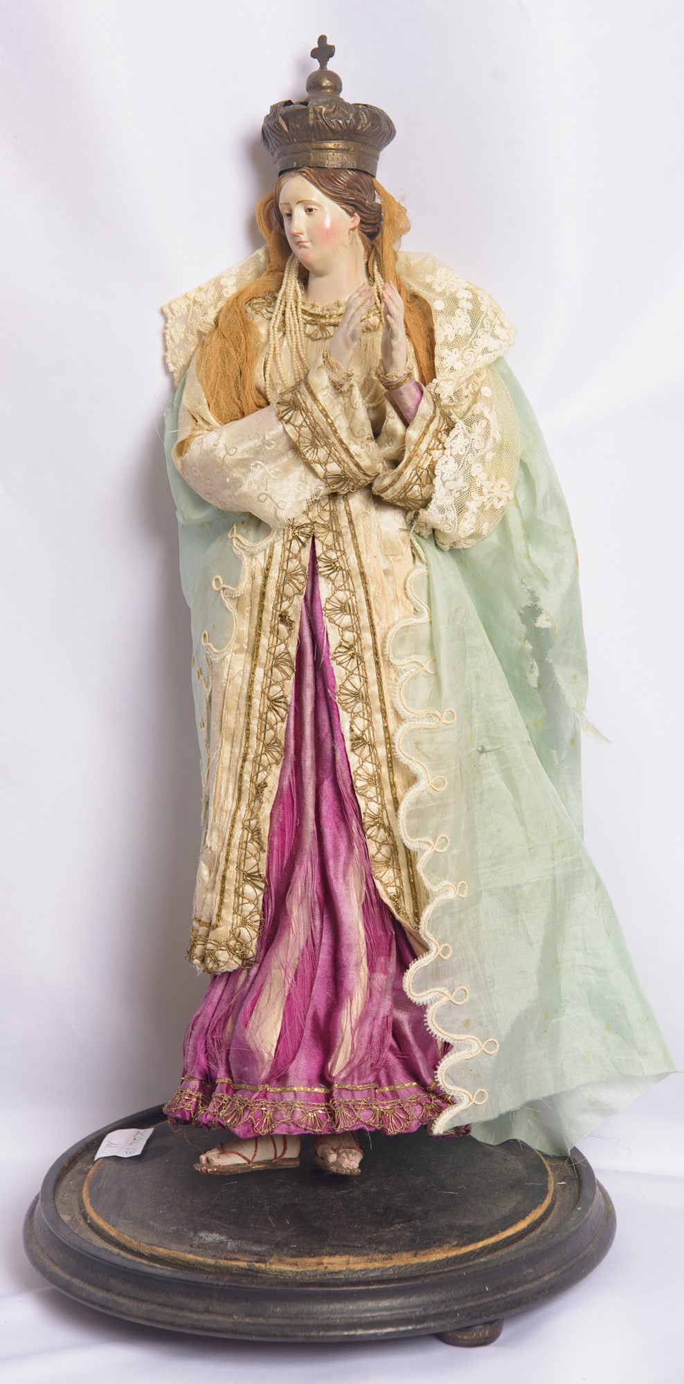 Abiti in tessuto e pizzo. Presentata in teca di vetro.