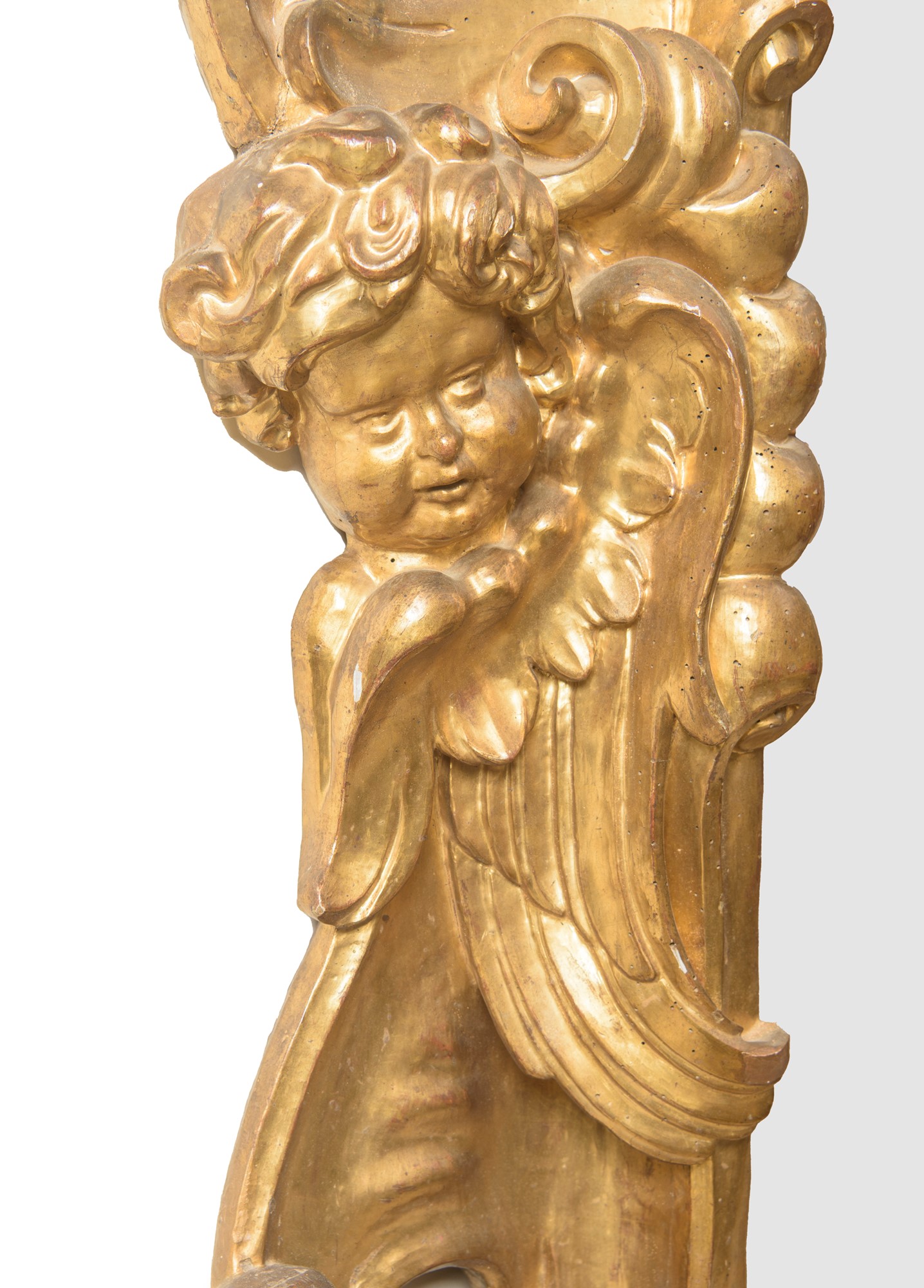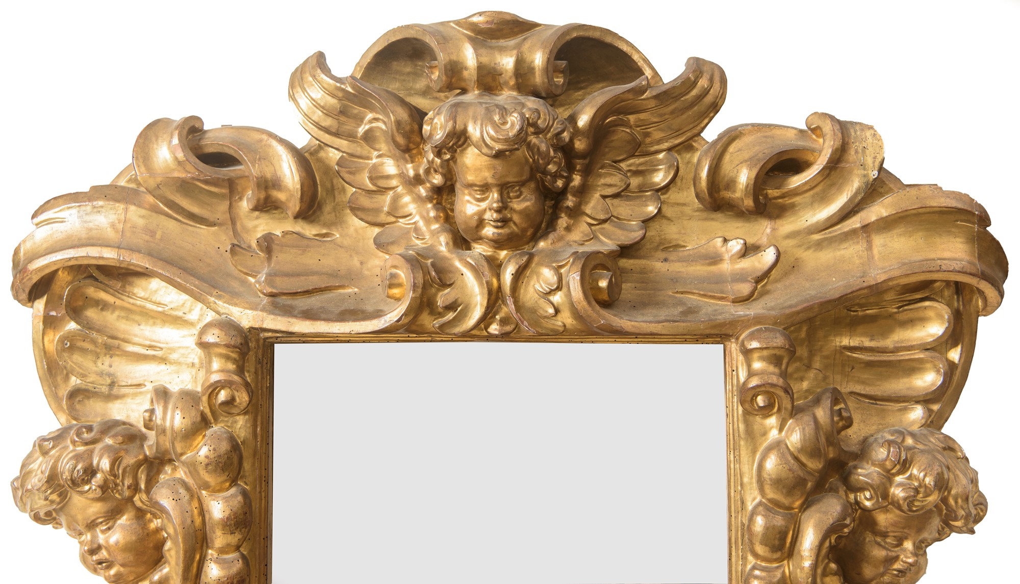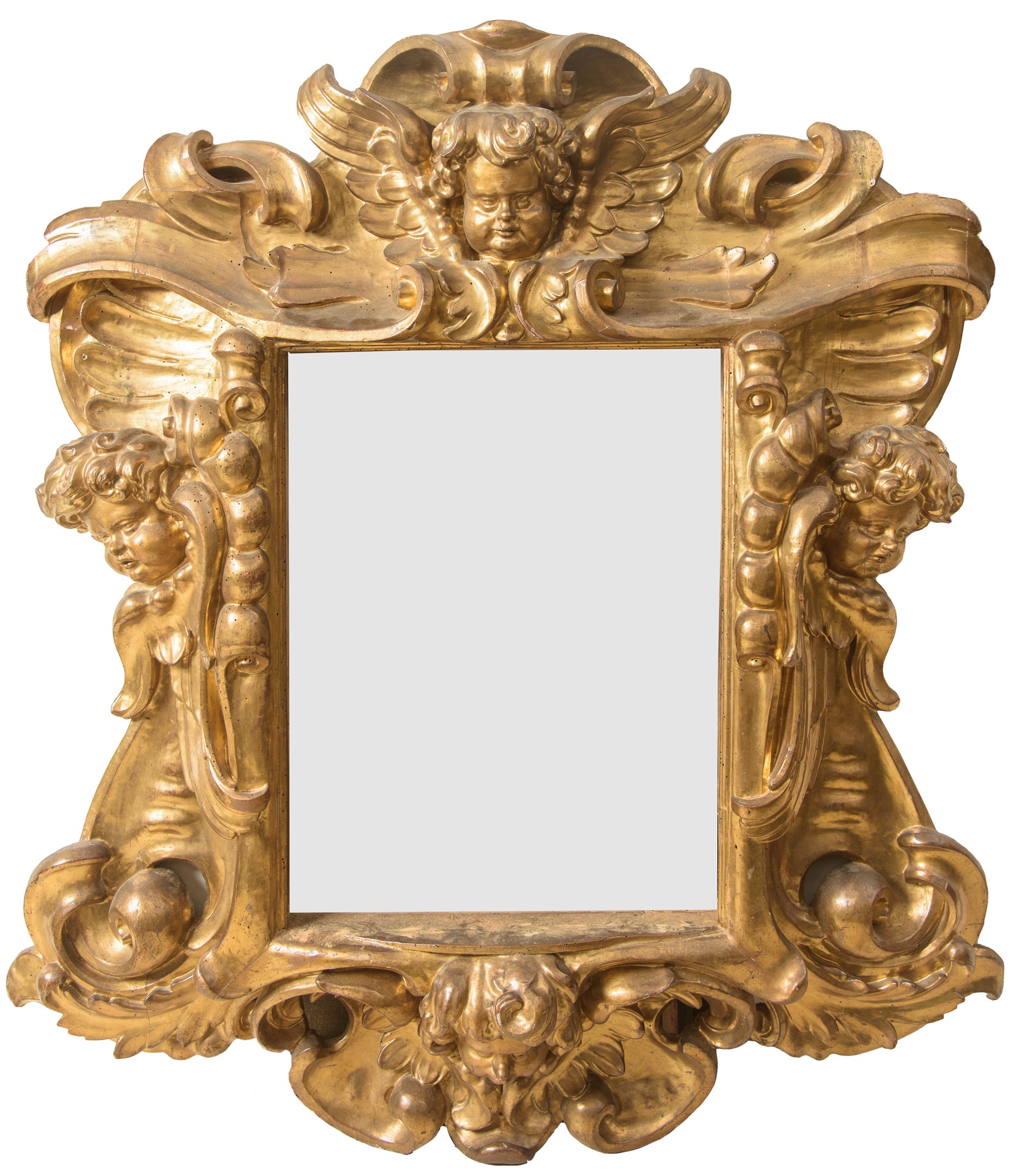 in legno di noce intagliato e dorato, con motivi ornamentali floreali e quattro teste di putto.