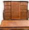 In noce e radica di noce, fronte marchettato e lesene laterali intagliate. Parte superiore con otto cassetti e scomparto centrale. Cornici ebanizzate. Manifattura tedesca - Luigi XIV.